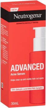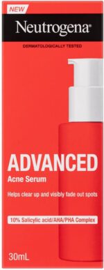 Neutrogena® Advanced Acne Serum contains 10% Salicylic acid/AHA/PHA Complex, a complementary mix of ingredients to effectively help prevent acne and help target visible redness, spots, and uneven texture. Our advanced technology helps to target the three signs of acne troubled skin – pimples, dark spots and uneven texture. With Clinically Proven Ingredients, this serum exfoliates and improves uneven skin texture and encourages cell turnover, and effectively unclogs pores and dissolves excess oil.