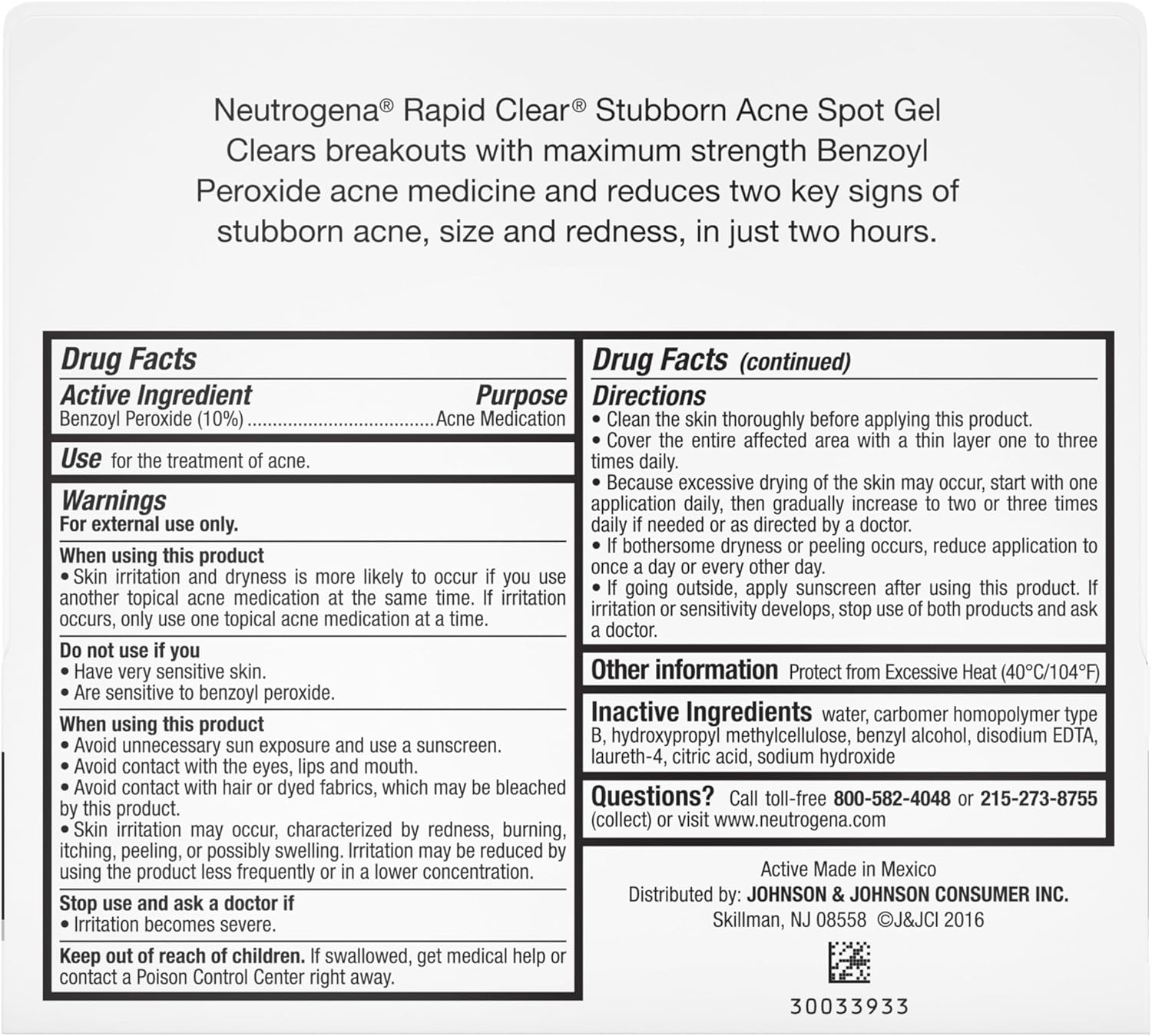 Neutrogena Rapid Clear Stubborn Acne Spot Treatment Gel is a maximum strength acne gel formulated with 10% benzoyl peroxide, the ingredient dermatologists recommend most for treating acne. This precision spot treatment is clinically proven to visibly reduce the size and redness of stubborn acne pimples in just two hours and helps prevent future breakouts. Designed for acne-prone skin, the non-prescription gel delivers continuous improvement of blemishes and clearer-looking skin with daily use. The 1 oz tube is ideal for targeted application on the face, making it easy to address problem areas as they appear. To use, cleanse skin thoroughly and apply a thin layer of gel to affected areas one to three times daily, following the recommended frequency for best results. The effective formula works quickly to minimize the appearance of acne pimples and supports ongoing skin clarity. Neutrogena, a dermatologist recommended brand, ensures this maximum strength acne treatment is suitable for daily use and is clinically proven to deliver visible results. The gel form allows for precise application directly to blemishes, distinguishing it from creams and washes, and making it a preferred choice for those seeking targeted acne care. By using this spot treatment as part of your regular skincare routine, you can help reduce the recurrence of breakouts and maintain a clearer, healthier-looking complexion over time. Experience the benefits of a clinically proven, dermatologist recommended acne gel that combines maximum strength 10% benzoyl peroxide with the convenience of a spot treatment for effective, visible results.