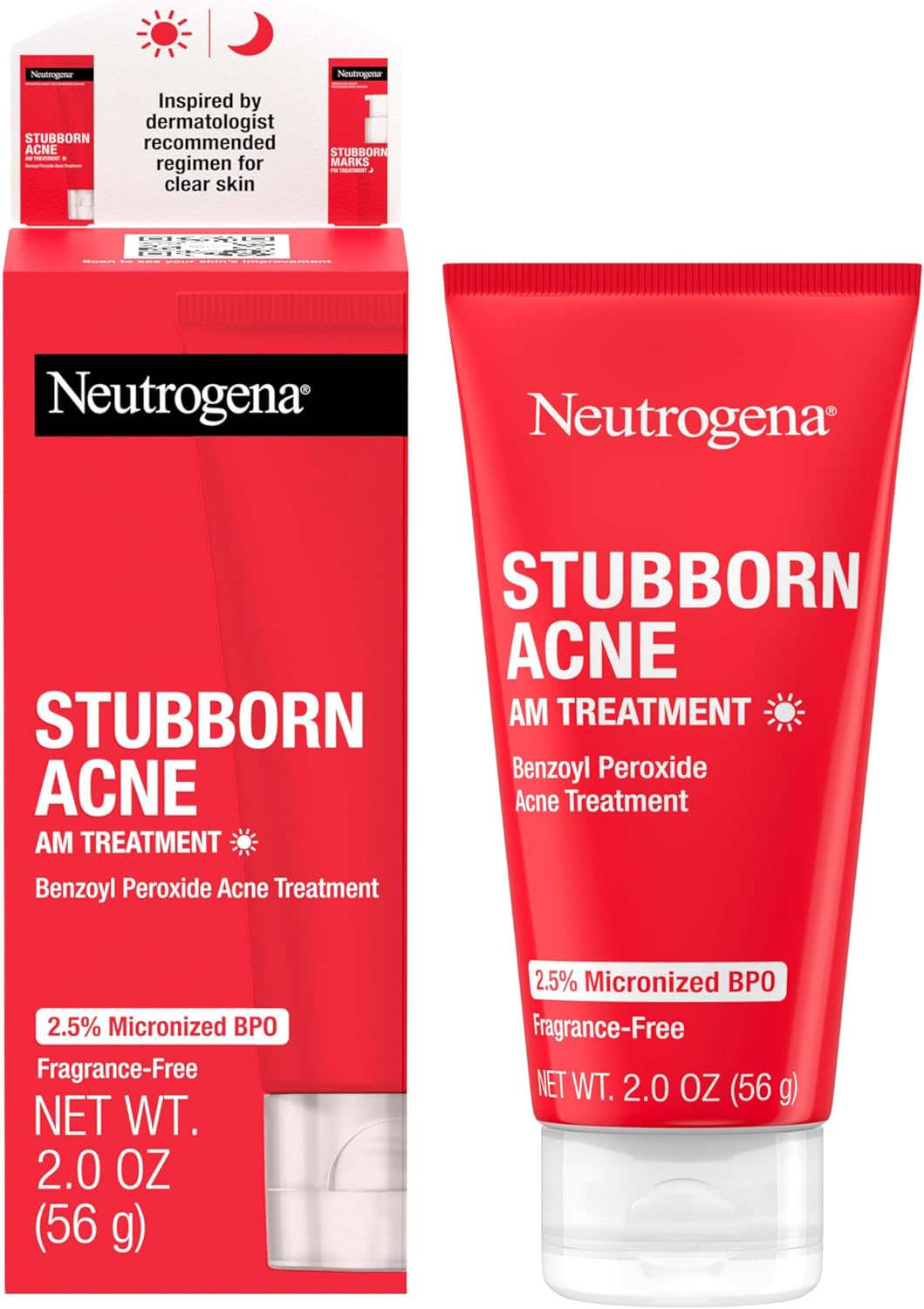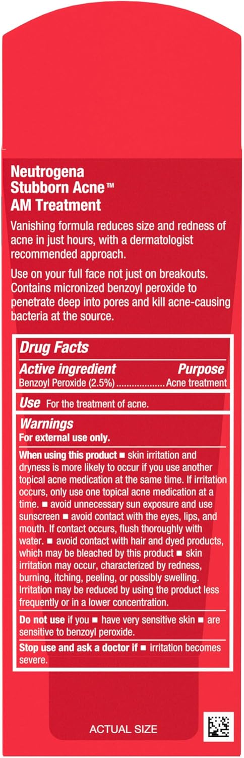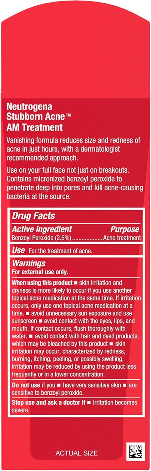 2-ounces of Neutrogena Stubborn Acne AM Treatment with 2.5% Benzoyl Peroxide, a dermatologist proven ingredient, works all day to help eliminate stubborn breakouts and reduce redness