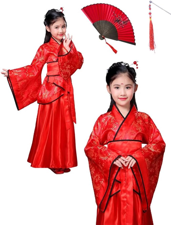 include: dress,Folding fan,Hair Accessories Size: Please refer to your height,If you are overweight, please buy one size larger Material: Polyester The girl Hanfu Traditional Dress Chinese is best choice for baby girl 100 day, 1st birthday party and important events. Chinese robe ancient scholar student costumes children girl Kimono China Traditional Vintage Ethnic cosplay Kid Costume Hanfu