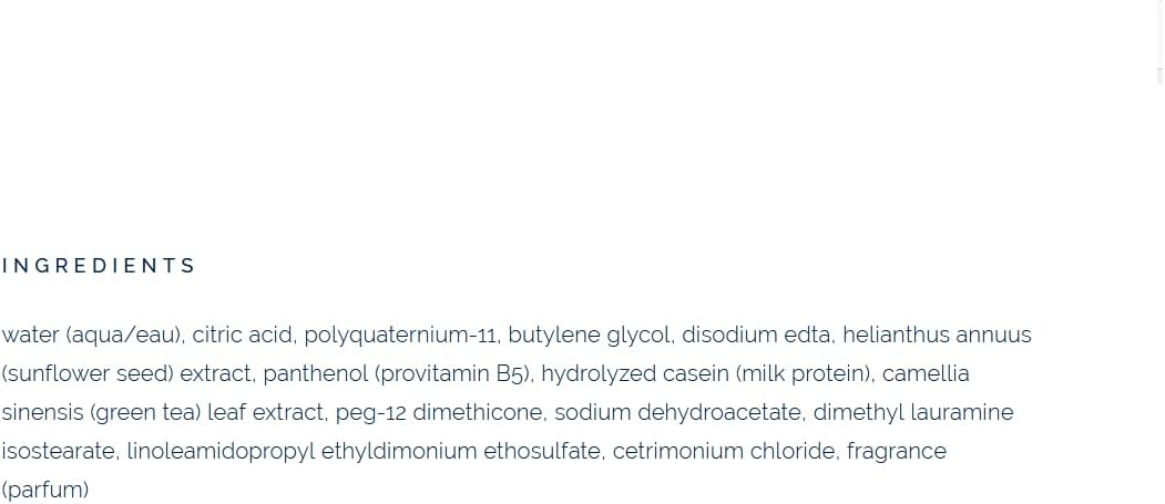 Ingredients: Water (aqua), citric acid, polyquaternium-11, butylene glycol, disodium edta, helianthus annuus (sunflower seed) extract, dimethicone copolyol, cetrimonium chloride, camellia sinensis (green tea) extract, sodium dehydroacetate, dimethyl lauramine isostearate, linoleamidopropyl ethyldimonium ethosulfate, panthenol (provitamin b5), hydrolyzed casein (milk protein), sorbic acid, fragrance (parfum).