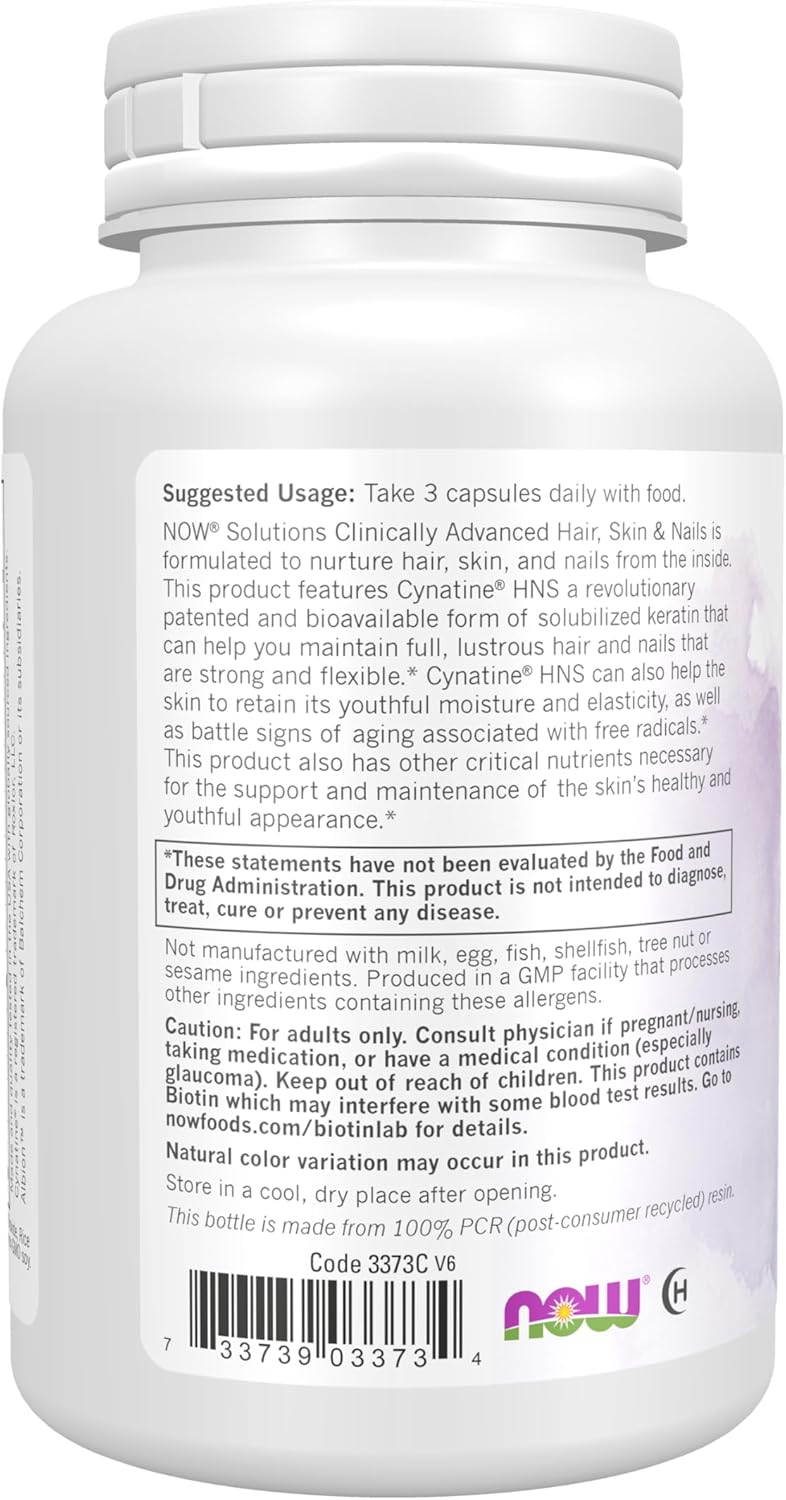 Clinically Advanced NOW Solutions Clinically Advanced Hair Skin & Nails is formulated to nurture hair skin and nails from the inside. Cynatine HNS can also help the skin to retain its youthful moisture and elasticity as well as battle signs of aging associated with free radicals. *This product also has other critical nutrients necessary for the support and maintenance of the skin’s healthy and youthful appearance. Cynatine is a registered trademark of Roxlor LLC. U. S. Patent 7838042 and patents pending and the trademark TRAACS are used under license from Albion Laboratories Inc.