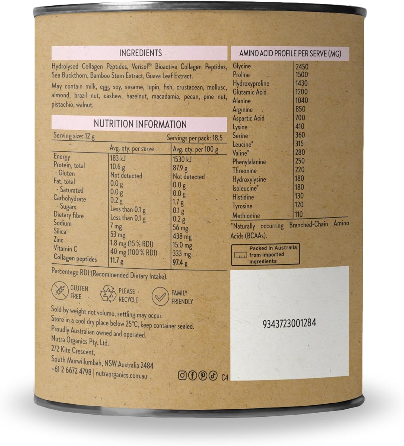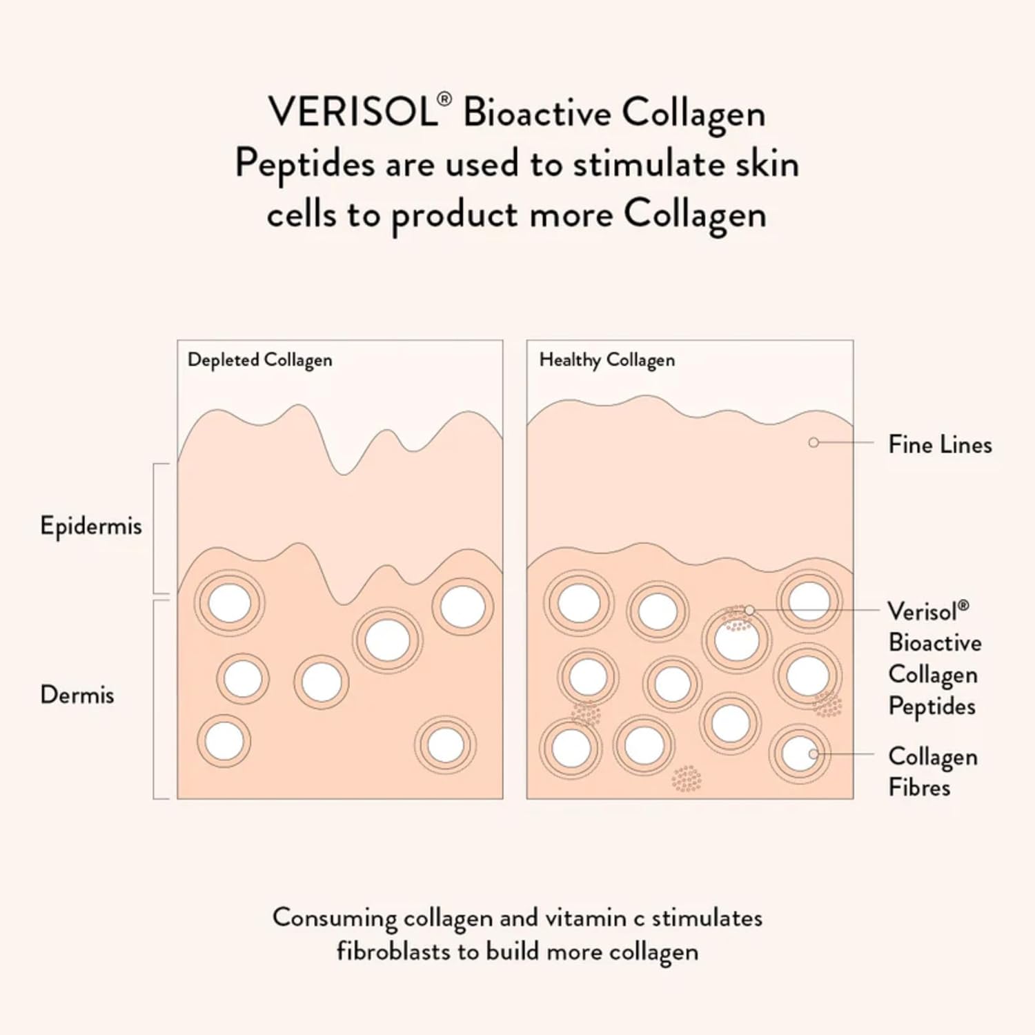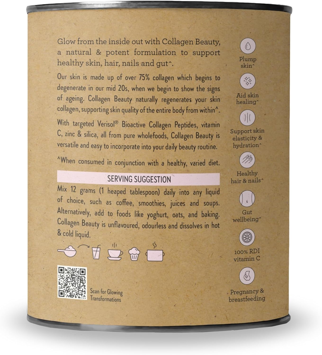 Collagen Beauty with VERISOL, as part of a balanced diet, is clinically proven to: Reduce skin wrinkles and smooth fine lines Increase skin hydration and improve moisture levels Increase skin elasticity Contributes to healthy gut and skin by supporting structure and function of connective tissue with Vitamin C Contribute to collagen formation & protection from free radical damage with Vitamin C Contribute to maintaining skin structure, support wound healing, and support healthy hair & nails with Zinc Support tissue building & repair, including gut & skin, with a good source of Protein. How is Collagen Beauty different to other collagens? Our naturopathically developed Collagen Beauty utilises the only scientifically researched bioactive collagen peptides, VERISOL, that have been shown in multiple studies to reduce skin wrinkles, improve skin hydration and elasticity, and improve hair strength and thickness. ⠀⠀⠀⠀⠀⠀⠀⠀⠀ Together with organic wholefood bioavailable sources of Vitamin C and Zinc, Collagen Beauty provides the necessary nutrients needed to promote collagen production in skin, as well as healthy hair and nails. ⠀⠀⠀⠀⠀⠀⠀⠀⠀ And with a generous amount of collagen (10g) in every 12g serve – you’ll experience far better results, much faster, than other collagens.