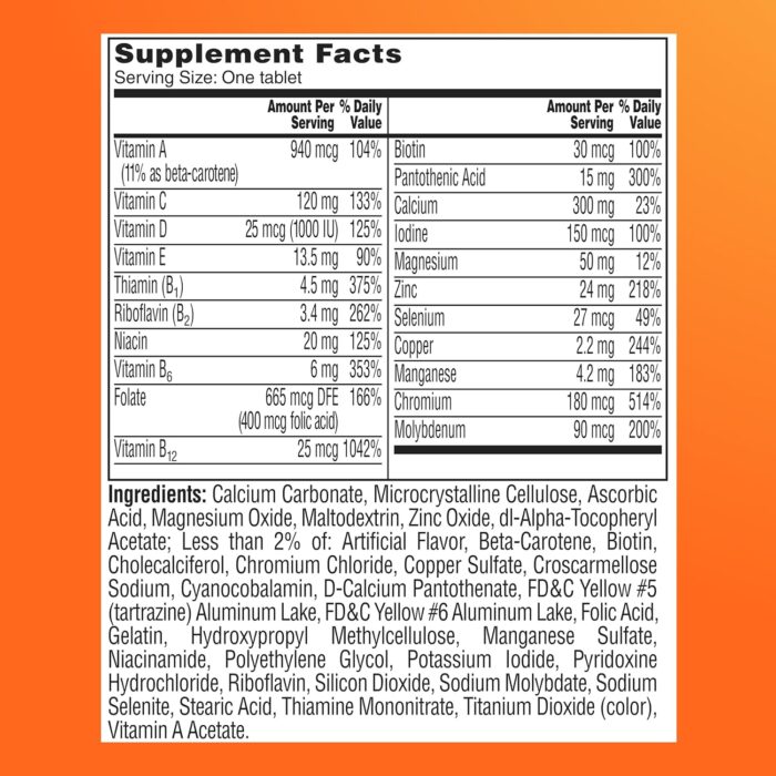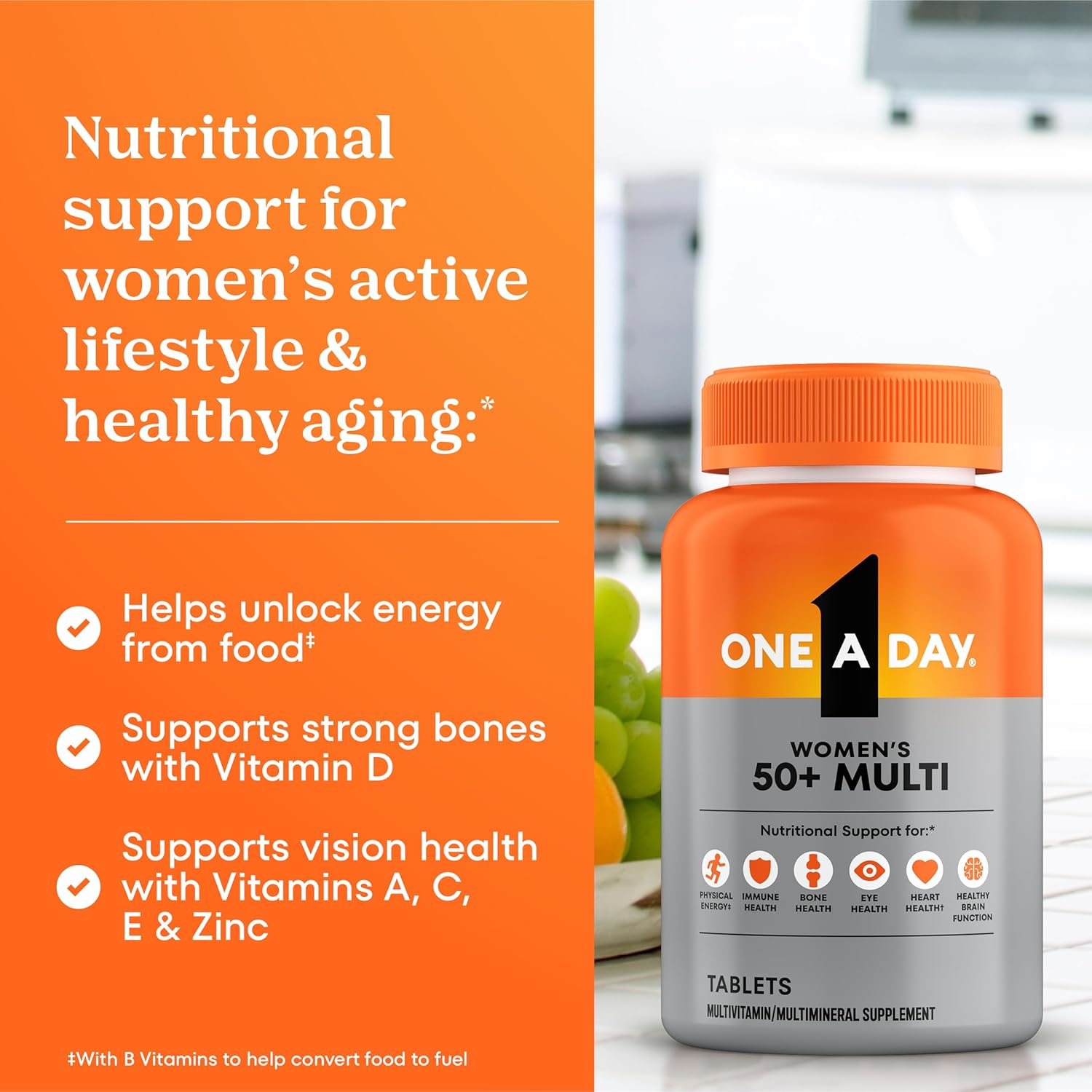 One A Day Women’s 50+ Healthy Advantage Multivitamins offer 100% or more of the Daily Value of at least 15 key nutrients in a single tablet. One A Day Women’s 50+ Healthy Advantage is designed to address health concerns of women as they age. This daily multivitamin contains Vitamins A, C, and E, Zinc, Selenium, Copper and Manganese to support cell health* in an easy to take pill. One A Day Women’s 50+ Healthy Advantage is Formulated to support:** bone health, joint health, heart health**, eye health, immune health, and physical energy by helping convert food to fuel.* One A Day Women’s 50+ Healthy Advantage Multivitamin is free of gluten, wheat, soy allergens, dairy, artificial flavors, and artificial sweeteners. Women over the age of 50 should take one tablet daily with food. One A Day Multivitamins can provide nutritional support that you and your family may need. **Not a replacement for heart medications. *This statement has not been evaluated by the Food and Drug Administration. This product is not intended to diagnose, treat, cure, or prevent any disease.