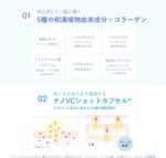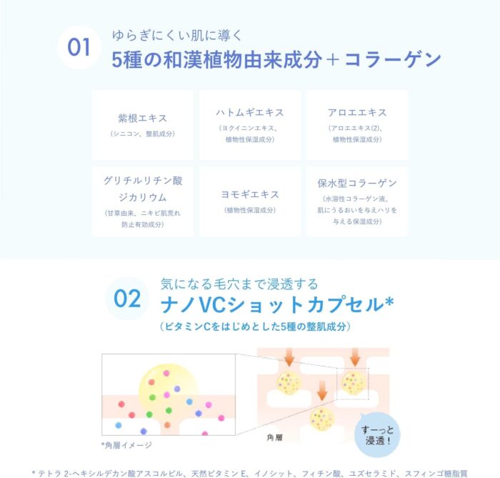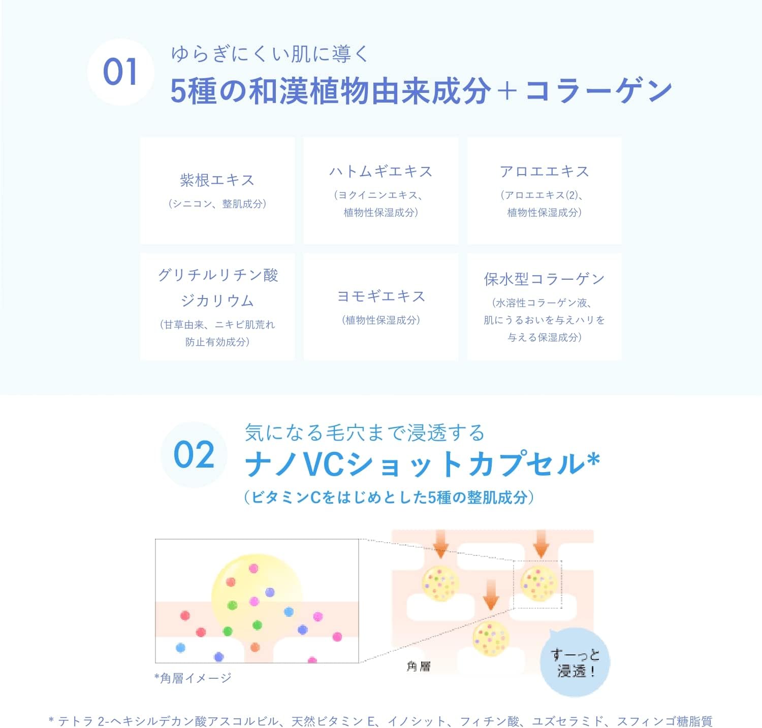 In addition, Nano VC Shot Capsules that consist of 5 skin-maintaining ingredients (*3) including vitamin C derivatives improve osmotic force and care for your pores (*2).It creates fresh, clean skin (*4).