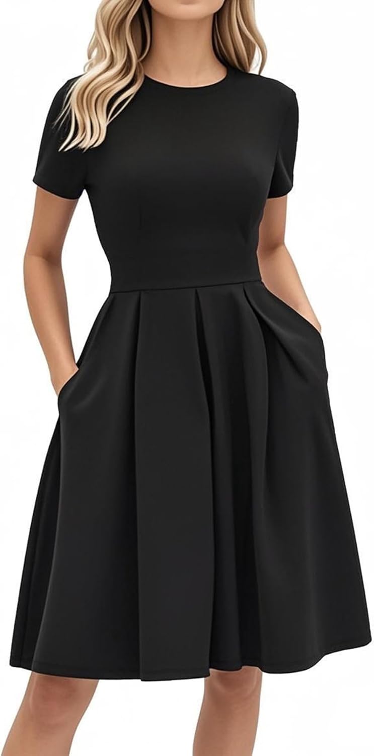 Women’s Classic Solid short Sleeve Casual Cotton Work Dress Vintage 1950’s party dresses with Pockets