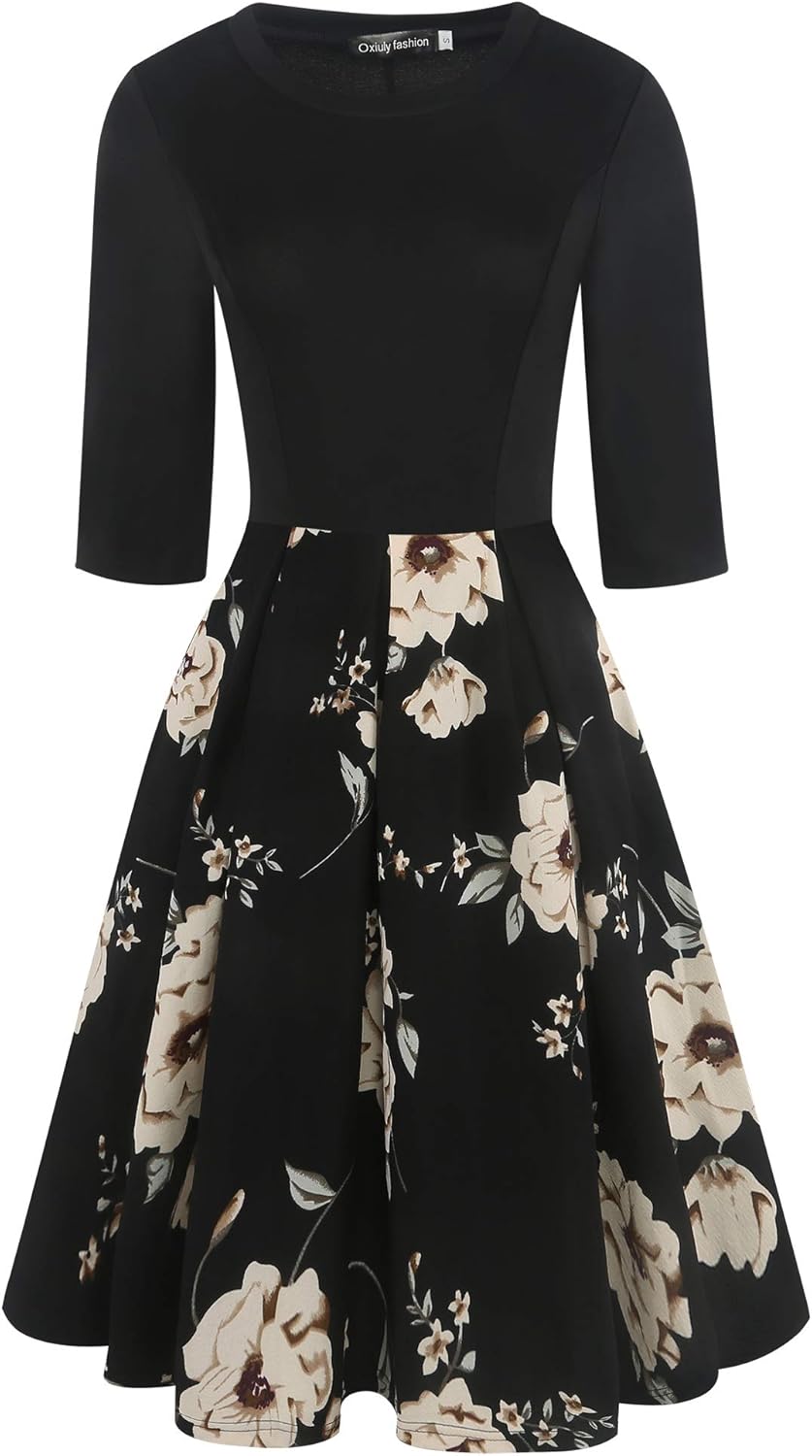 oxiuly Women’s Vintage Half Sleeve O-Neck Contrast Casual Pockets Party Swing Dress OX253