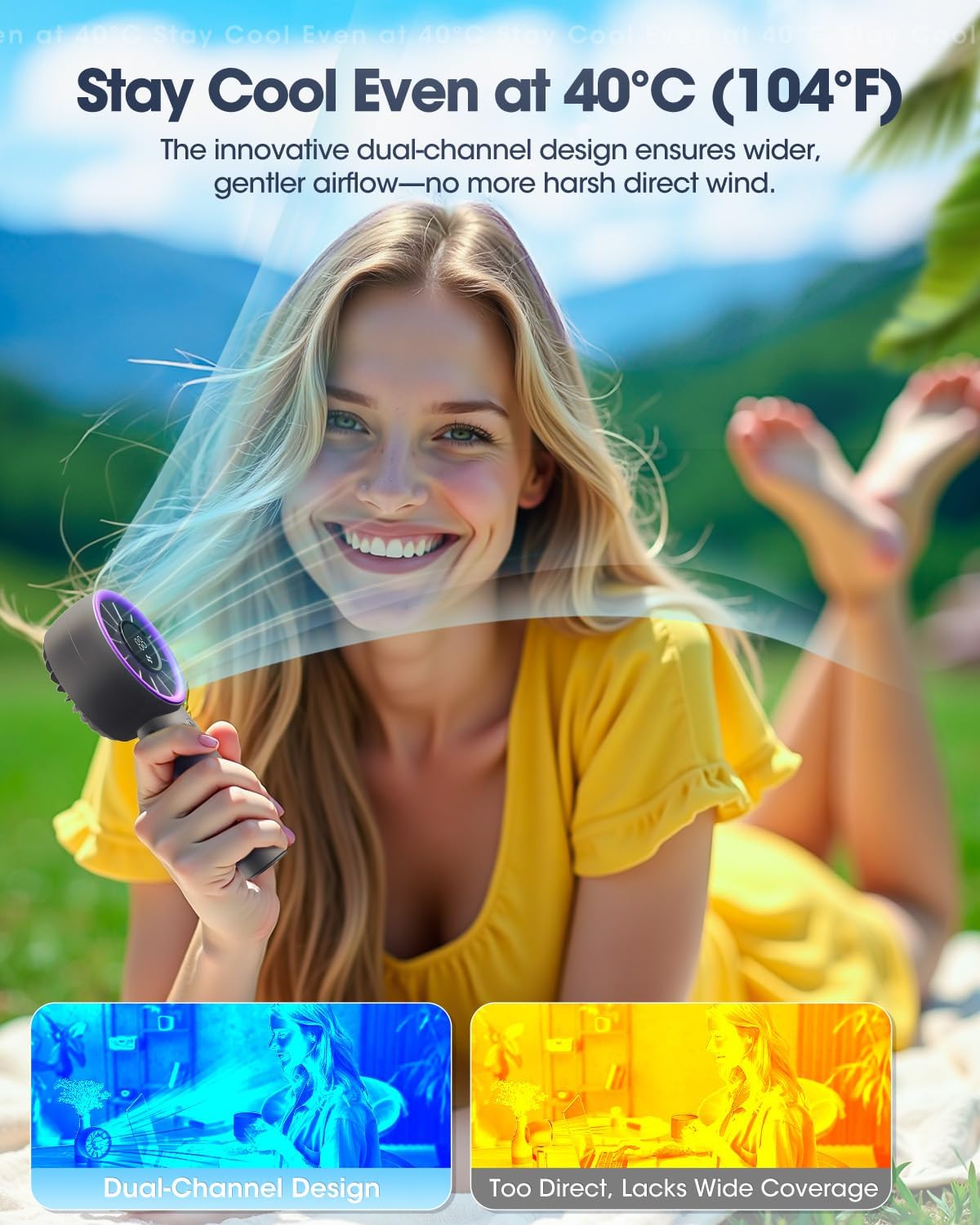 【Innovative Dual-Channel Tech】Say goodbye to harsh, direct wind! The JINLICTE dual-channel handheld fan features two layers of airflow design, delivering wider and gentler cooling that feels like a natural breeze. Unlike traditional portable fans, our innovative design ensures even airflow distribution—perfect for indoor relaxation, outdoor adventures, or even makeup touch-ups. Whether you need a gentle breeze or a powerful gust, this personal fan adapts to your needs.