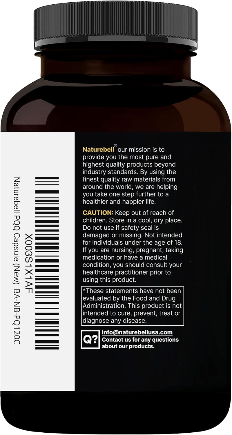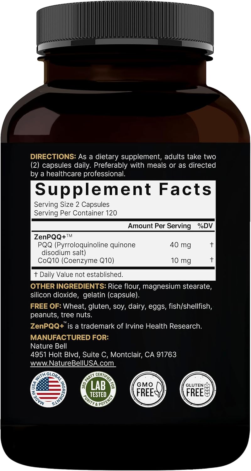 NatureBell special PQQ supplement made with the powerful ZenPQQ+ formula. Produced with a potent active blend of 20mg PQQ + 5mg CoQ10. Offering 2 in 1 dual enhanced support for the perfect atp fuel. 120 vegetarian capsules with only 1 capsule per serving that equal a 4 months supply.