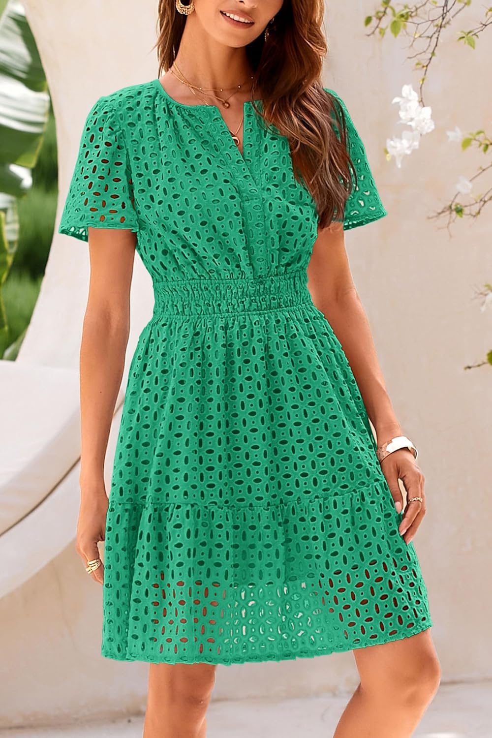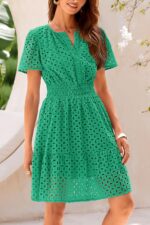 Fashion Style: Short Sleeve, V Neck, Empire Waist, Mini Length, A-Line, Ruffle Hem, Hollow Out Lace
