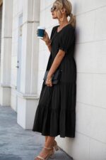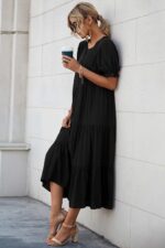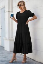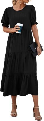 PRETTYGARDEN Women’s Short Puff Sleeve Loose Plain Midi Dresses Summer Beach Casual Black Dress