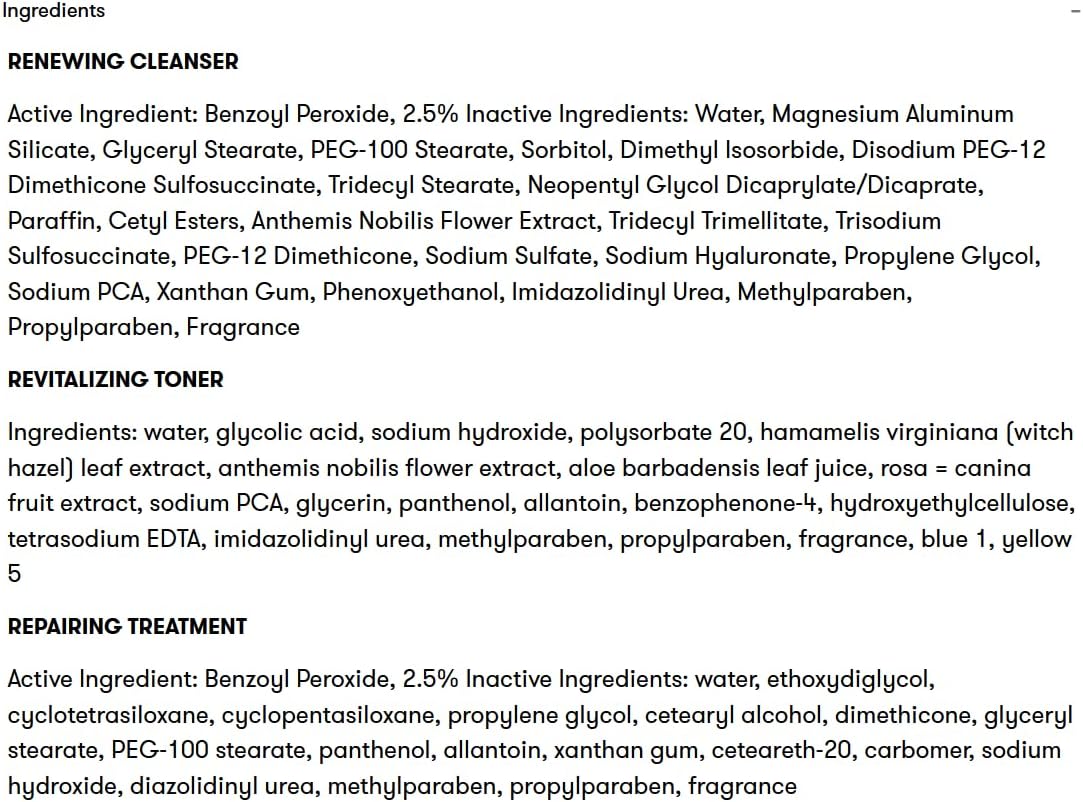 It’s the first 3-step acne treatment system that started a skin care revolution. Designed specifically for acne-prone skin, this Proactiv acne treatment kit delivers finely-milled benzoyl peroxide deep into your pores to help stop acne-causing bacteria in its tracks and prevent new breakouts from forming. This acne kit includes Renewing Cleanser, an acne face wash, Revitalizing Toner, and Repairing Treatment, the original acne treatment cream. The starter acne treatment system is a 30-day introductory size of Proactiv Solution 3-Step regimen to help ease your skin into your new acne care program. As you incorporate Proactiv into your regular routine, you should begin to see visible changes to your skin in the weeks ahead. In the first week, your skin is acclimating to the Proactiv acne treatment. You may experience some dryness, slight flaking, and irritation in these early days. This is totally normal. As with any acne product, be sure to use a sunscreen of at least SPF 30 every day to protect your skin. Proactiv has a complete line of products beyond the 3-Step System, including acne, moisturizer, hydrating moisturizers, sunscreens, acne spot treatments and acne body washes, all formulated specifically for acne prone skin.