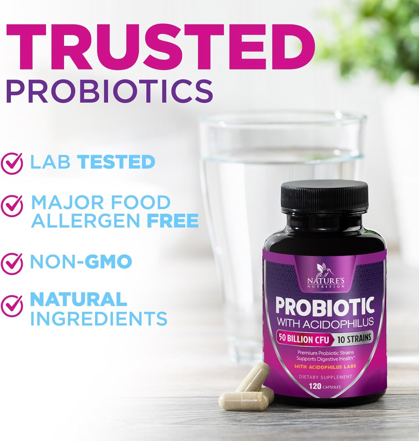 Nature’s Nutrition Probiotic has been formulated with 60 billion live CFUs per serving. Each batch of probiotics are reviewed by an independent, 3rd-party laboratory for quality and purity.