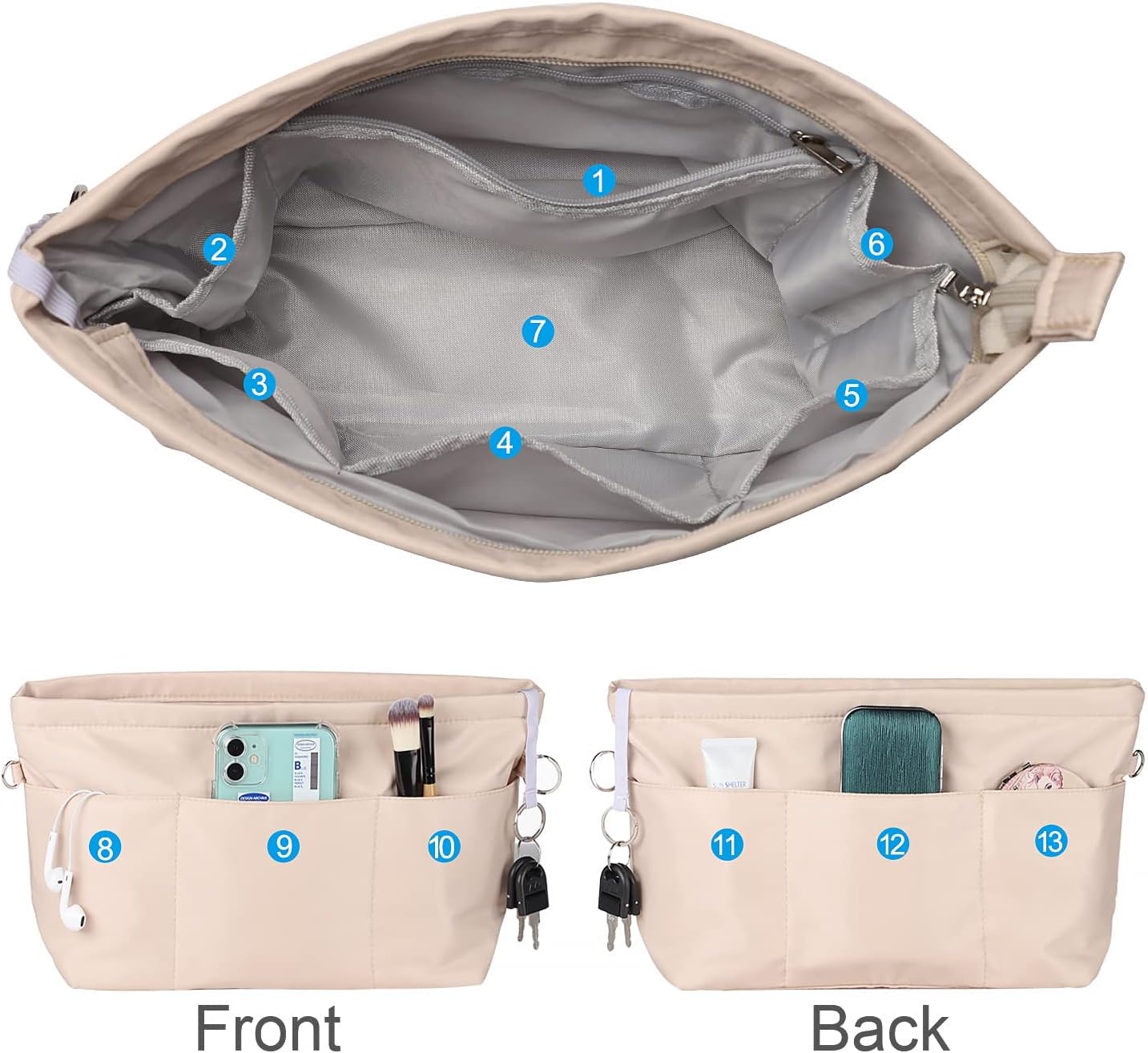 【Multiple Pockets】Includes 13 pockets in total—6 on the outside, 7 inside, plus a zippered middle pocket for valuables—ideal for organizing items in a tote