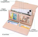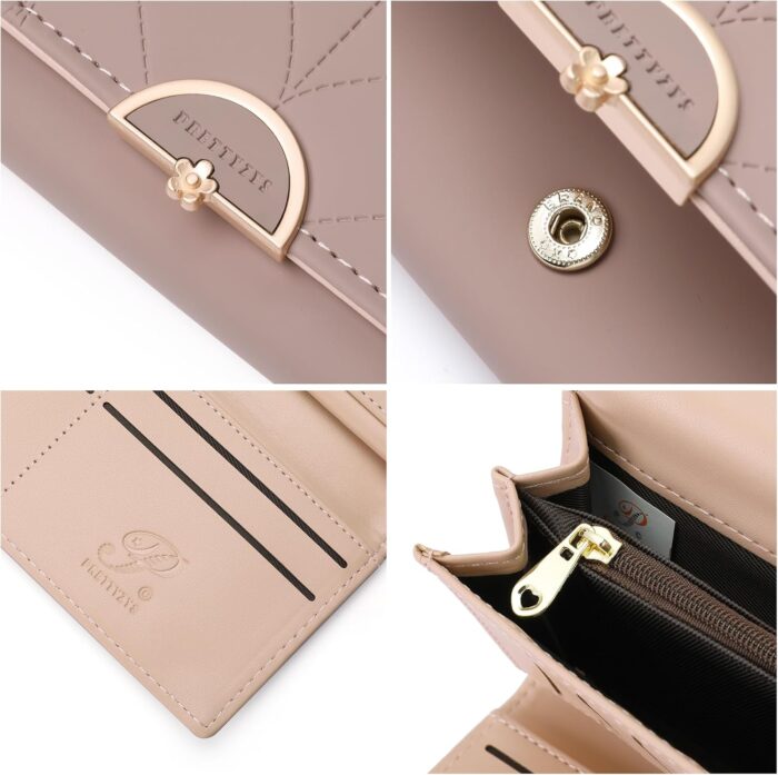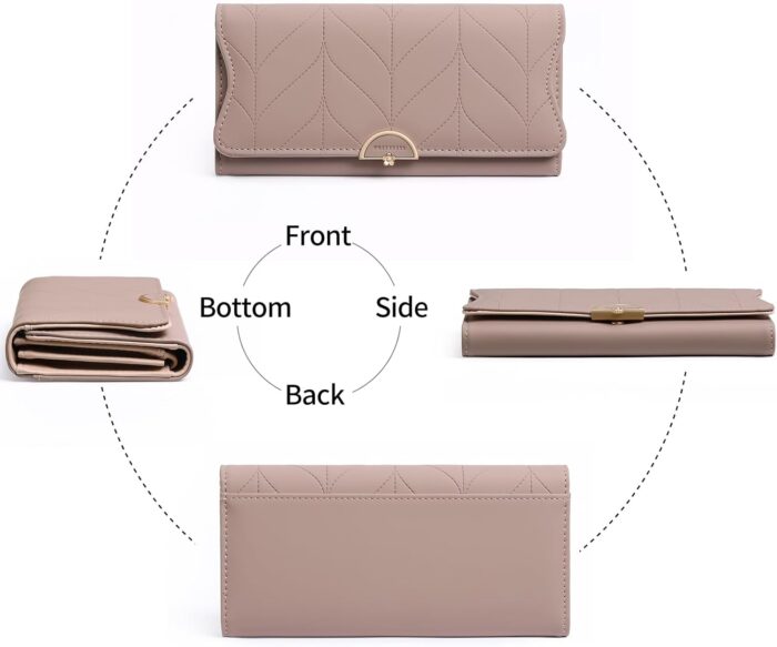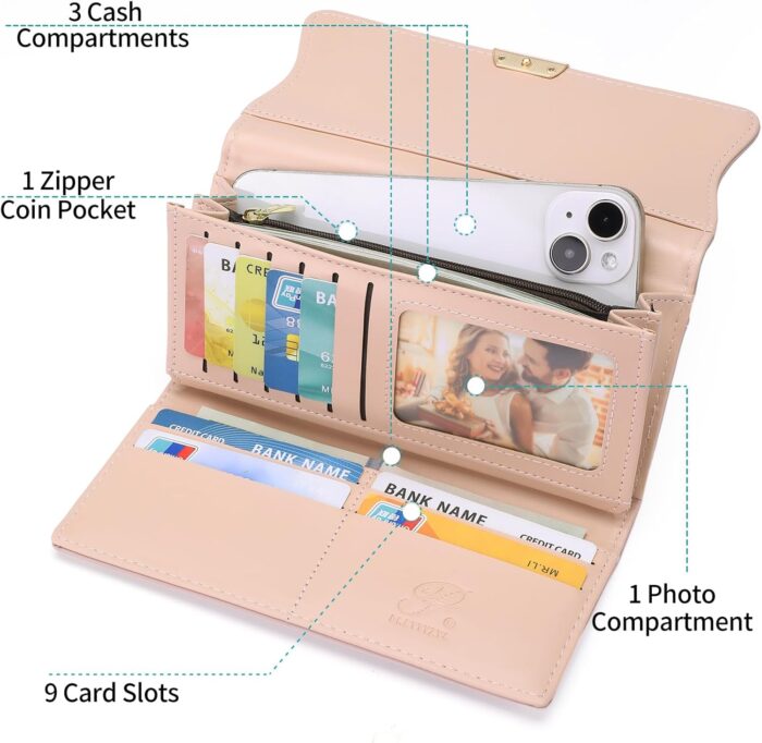 Large Capacity: Women wallet has 9 card slots, 2 main cash/checkbook pocket, 1 bills pocket, 1 inner zipper pocket and 1 transparent ID window.The girl wallets enough to help you organize your essentials.