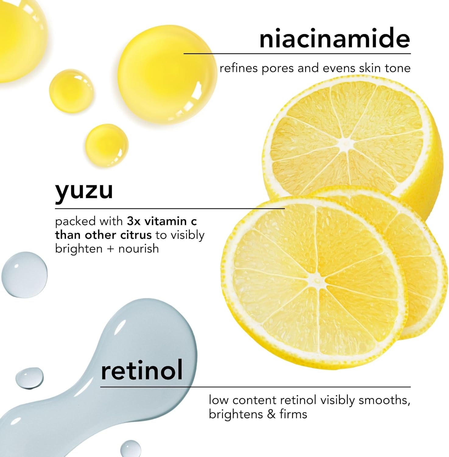 Vitamin C from Yuzu brightens and protects skin against environmental stressors; Niacinamide strengthens the barrier, minimizes pores, and evens tone; Retinol smooths texture and supports cell turnover; Antioxidant oils from Yuzu and Seabuckthorn and peptides lock in hydration and promote elasticity. Together, this clinically-inspired formula works to visibly reduce dullness, dryness, and early signs of aging while delivering plump, radiant skin.