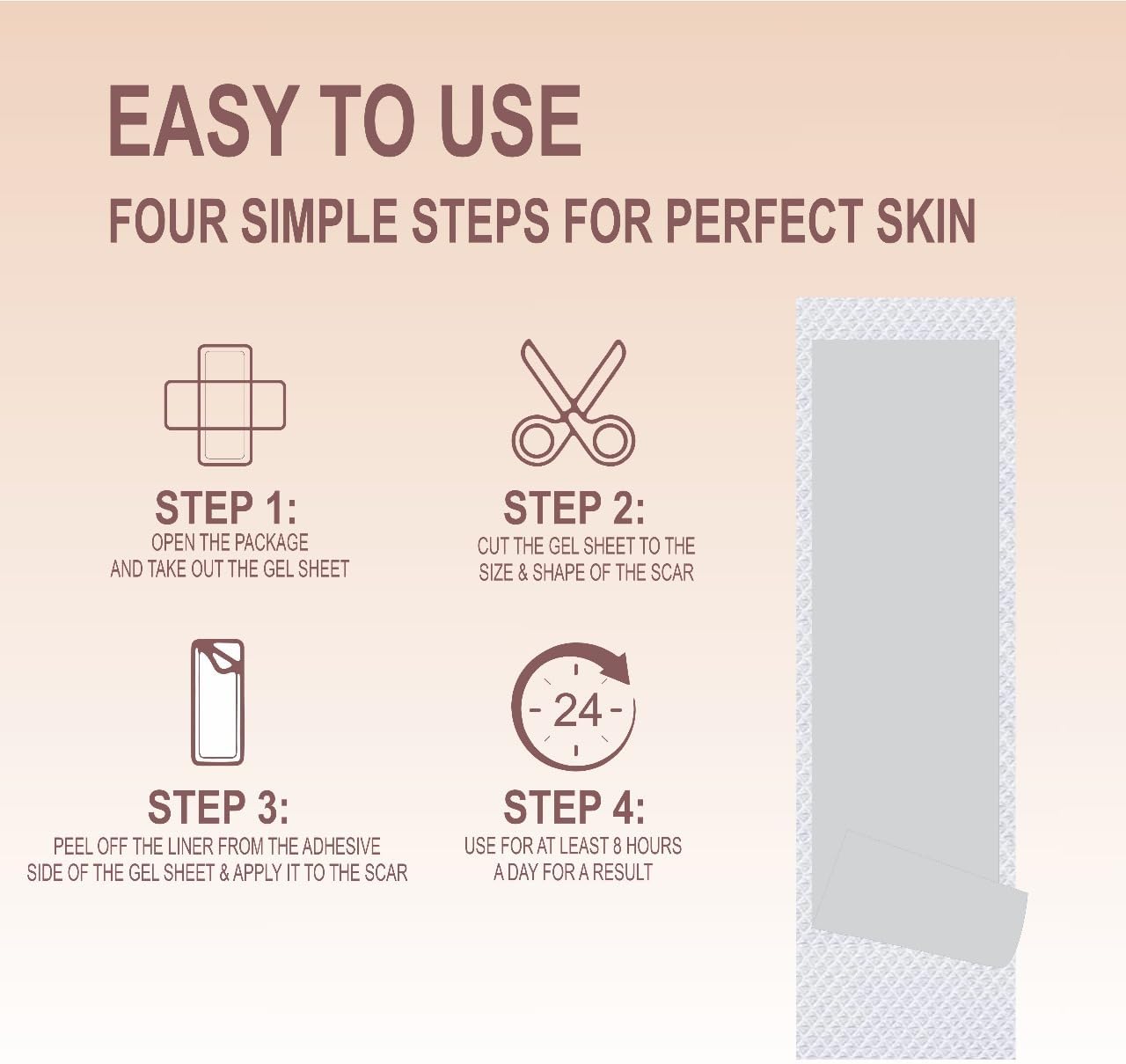 Clean and Prepare: Wash hands and the scar area with mild soap and water.Cut to Size: Use clean scissors to cut the sheet slightly larger than the scar.Apply Firmly: Peel off the backing, apply smoothly to the scar, and wear as directed.Replace and Maintain: Follow recommended wear duration and replace as needed.Gentle Removal: Remove gently, clean with water and mild soap, and repeat until desired results are achieved.