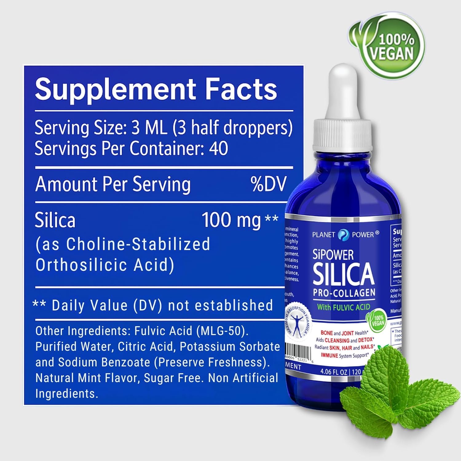 SiPower Silica Vegan Collagen + Fulvic Acid 4oz Glass Bottle, Immune System, Maximum Absorption – Concentrated Formula, Bones, Joints, Skin, Hair, Nails, Cardiovascular and Digestive System. 40 Days