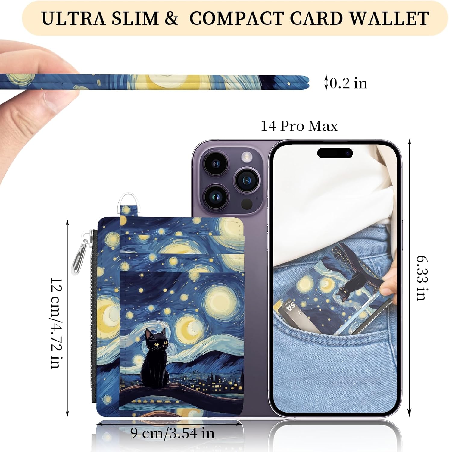 【Small But Roomy】Small card wallet use unique starry night black cat design on the outside, it can be worn as a daily accessory. Mini credit card holder measuring only 4.72 x 3.54 x 0.2 inches, thin and lightweight for easy carrying, ultra slim wallet allows you to bring it along in your front pocket, handbag, backpack, purse and travel bag without any bulk
