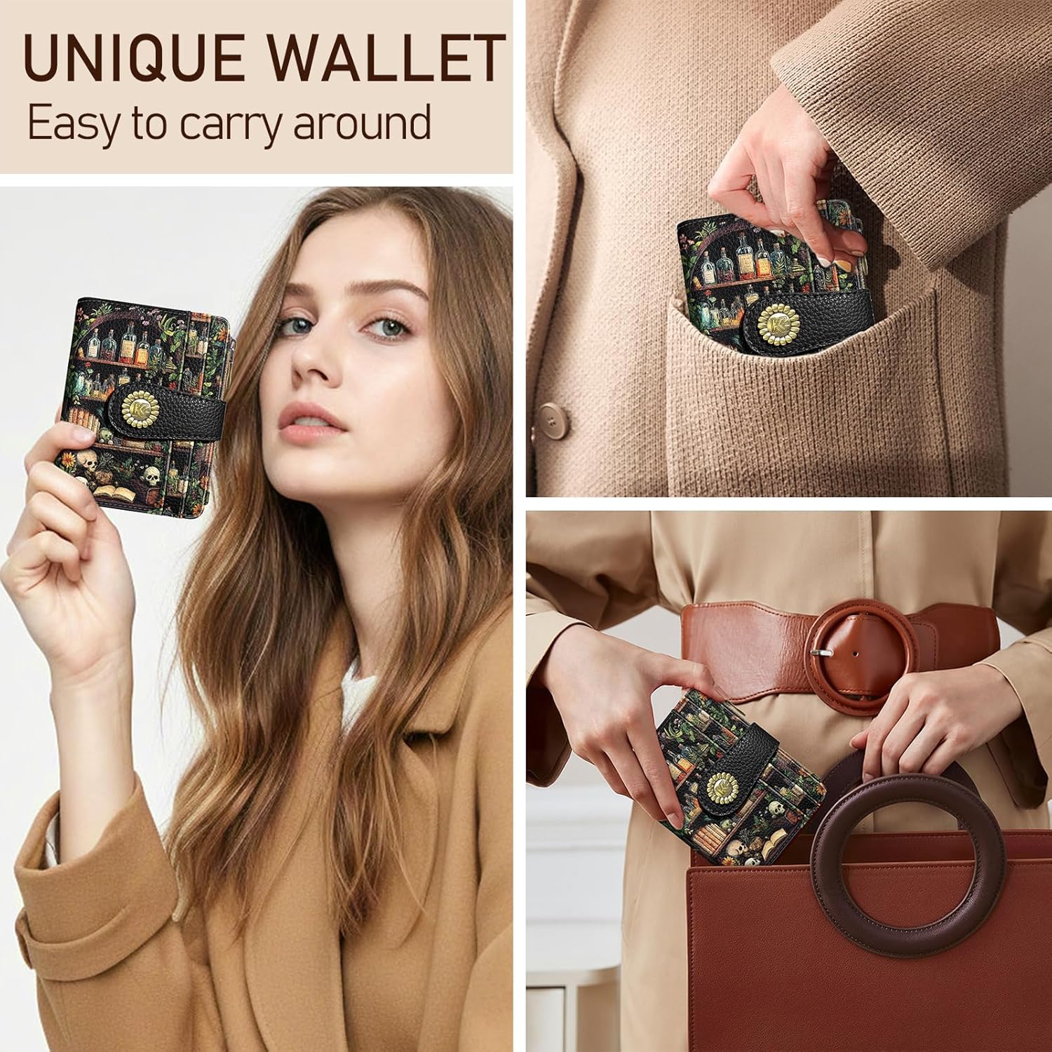 Stylish Bifold Design: Printed with bookshelves, skulls, books, flowers and glass bottles, this goth skull wallet features a secure bifold structure for effortless portability; Its small profile fits into pockets, purses, or clutch bags, offering versatile functionality for work, events, dating or casual outings; A minimalist yet fashionable credit card wallet for every occasion