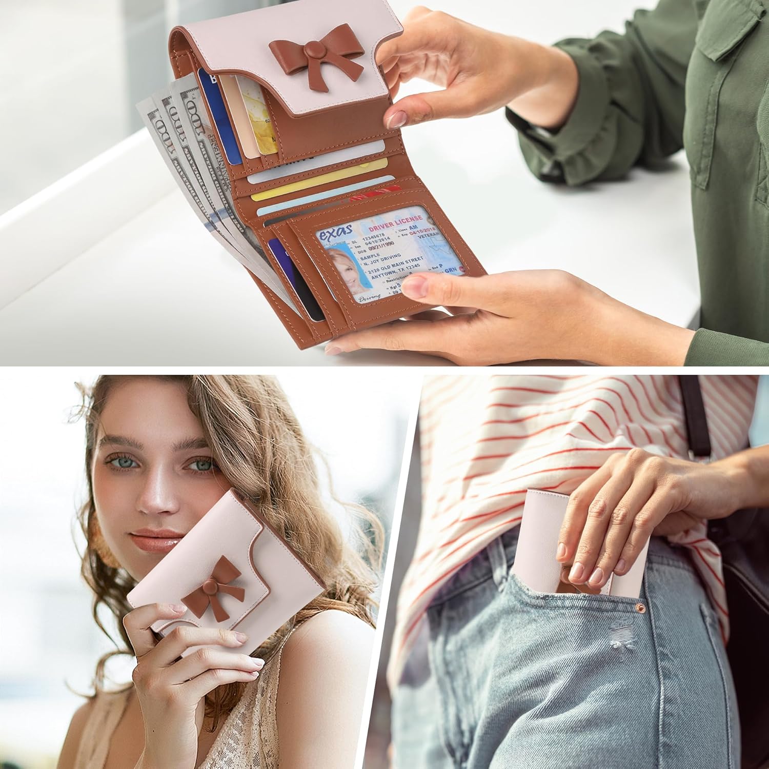 Cute Bow Womens Small Wallet: With 8 card slots, 1 ID window, 1 cash compartment and 1 zipper pocket, this small compact card holder wallet can meet your daily demands.