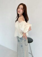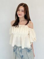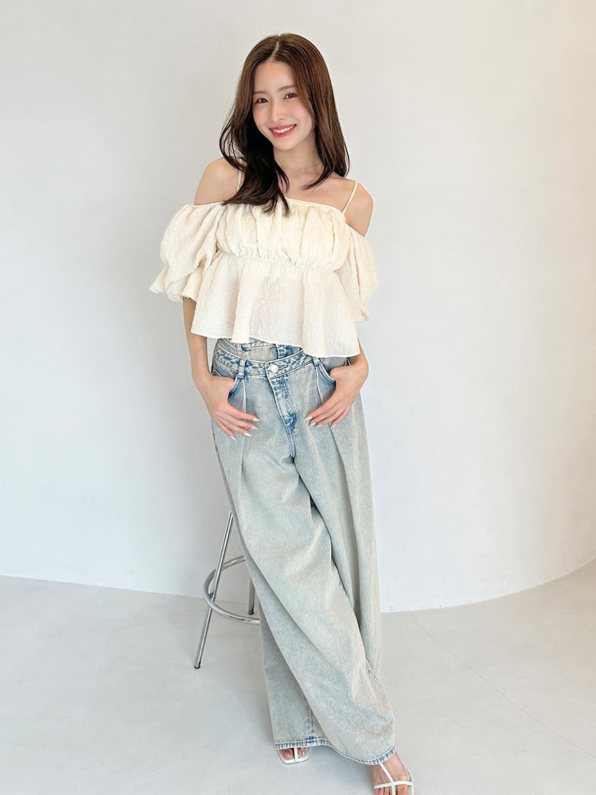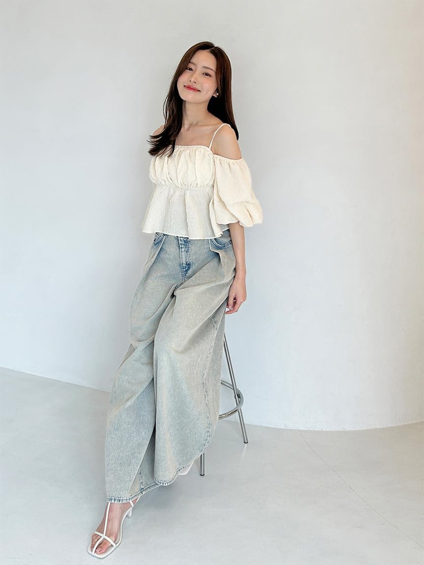 This casual blouse from SNIDEL is made of jacquard fabric with a glossy and wrinkled surface. The bust part is ruched and plump while the sides are tight, creating a crisp peplum design. The hem has a soft peplum silhouette that makes your legs look beautiful. Generous elastic shirring at the back for a flattering fit and a structured silhouette yet comfortable finish. Off-shoulder design with shoulder strap for worry-free wear. The sleeves have gathered and voluminous finish for a luxurious look. Adjustable strap with adjuster. Made with a slightly cropped length, this season strikes a balance between casual denim styles and beautiful tight skirts.