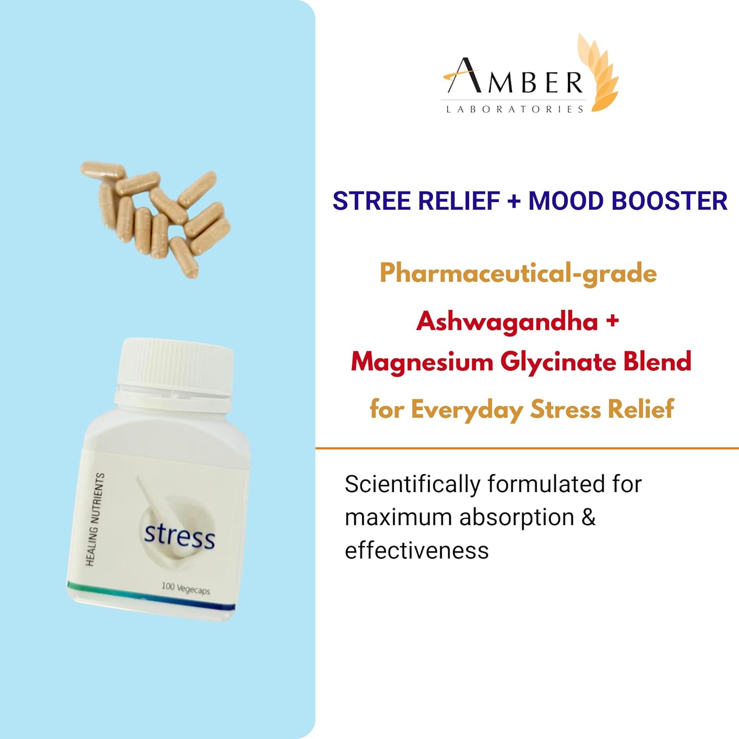 Amber Laboratories Stress Relief Adaptogenic Supplement is a clinically balanced formula designed to restore calm, support mood, and help the body adapt to everyday stress. Each serving delivers 200mg of Ashwagandha—a powerful adaptogen known for reducing cortisol levels—combined with 300mg of highly absorbable Magnesium Glycinate to ease nervous tension and promote relaxation. Crafted in Singapore by Amber Laboratories, this premium stress relief supplement is pharmacist-formulated, ISO 9001-certified, and made in small batches for superior potency and purity. Trusted by healthcare professionals for over 15 years, Amber’s adaptogenic blends combine modern science with clean, natural ingredients. Whether you’re facing work stress, sleep disruption, anxiety, or mood dips, Amber Stress Relief provides a gentle, effective, and natural way to support mental well-being. Choose Amber Laboratories supplements—made in Singapore with uncompromising quality, trusted for resilience, calm, and balance.