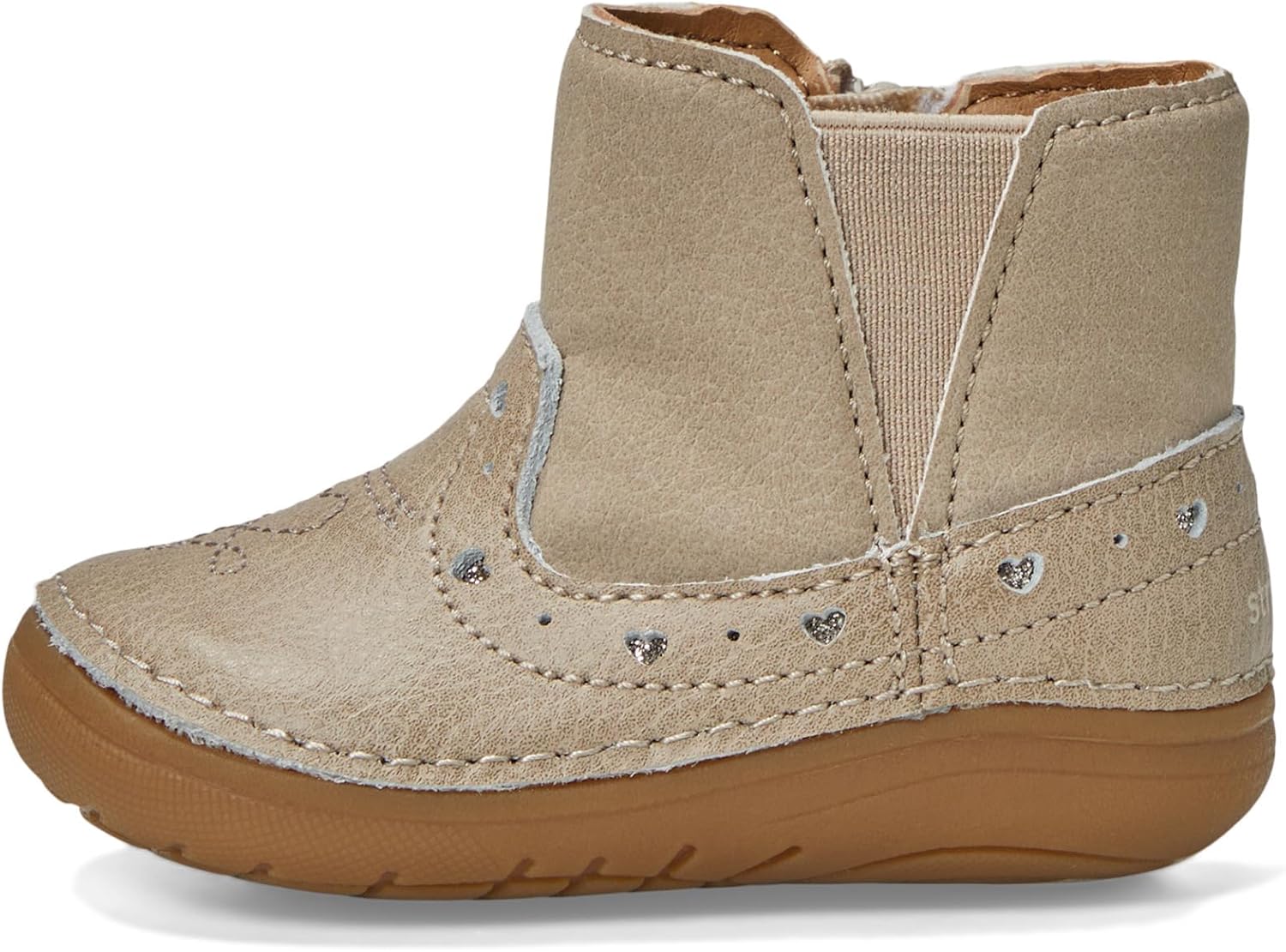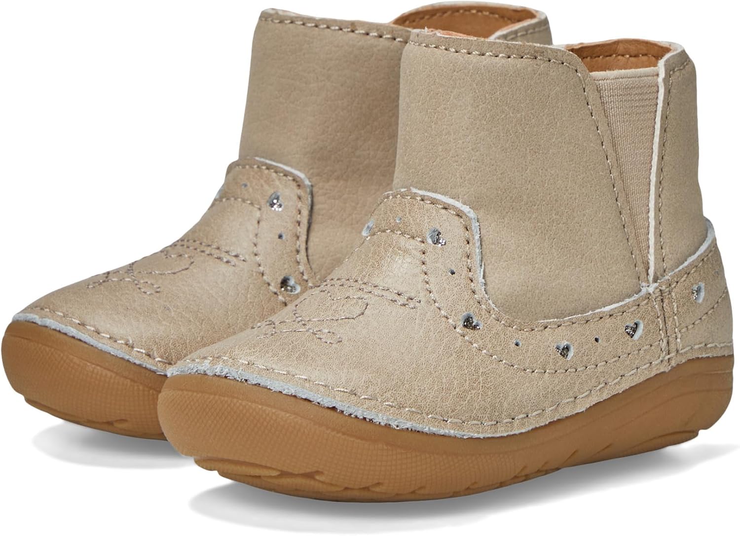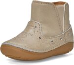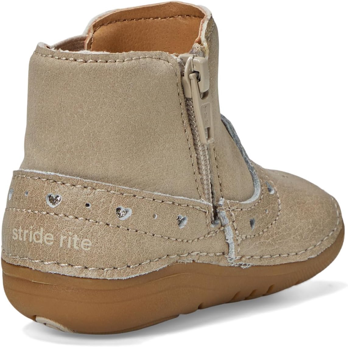 Let your little one take baby steps in comfort and style wearing the Stride Rite SM Gigi Shoes. These round-toe shoes feature a metallic leather upper with elastic side gore & side zipper closure for easy on/off, recycled cotton lining, and ortholite memory foam for enhanced comfort. The seamless construction cradles the foot’s natural shape, oversized opening for easy-on, and flexible rounded rubber outsoles to encourage natural movement and help improve balance, superior traction and grip. Round toe shape. APMA approved.