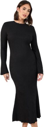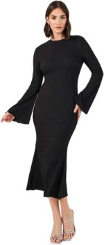 Home Clothing & Fashion Dresses Styli Women Textured Knit Bell Sleeves Bodycon Midi Dress