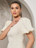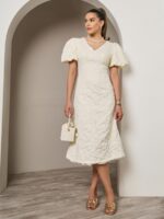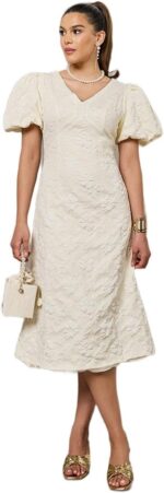 Category: Dresses Tags: Aline, Dress, Embossed, Floral, Midi, Puff, Sleeves, Styli, Womens