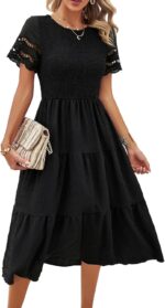 SYKT Women’s Summer Casual Lace Short Sleeve Crew Neck Smocked Elastic Waist Tiered Midi Dress