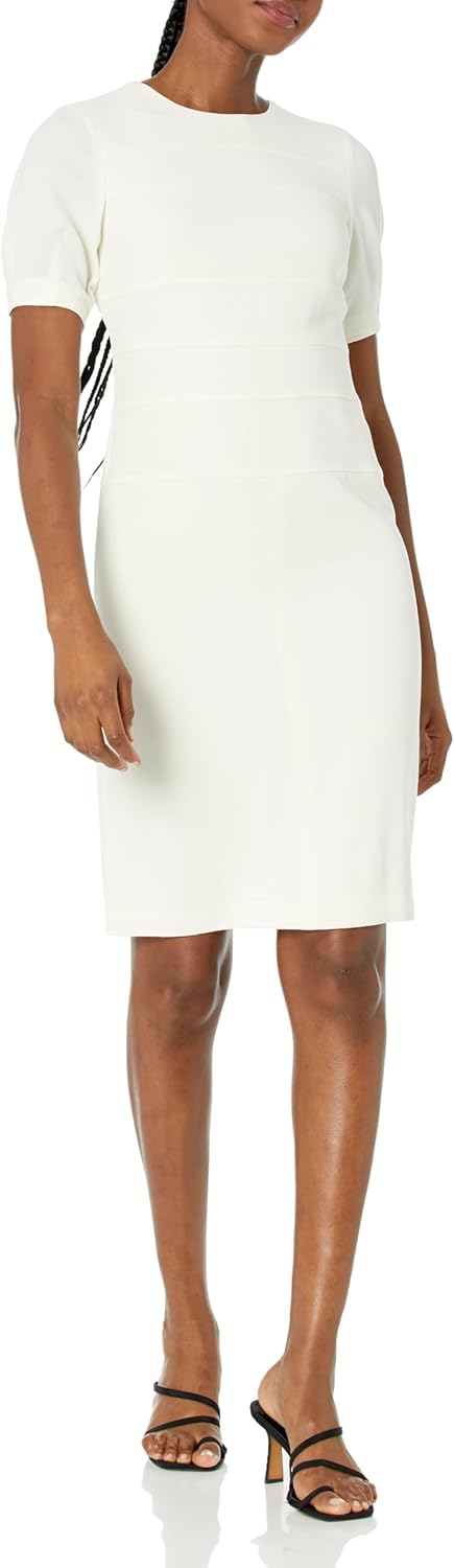 This Tommy Hilfiger Women’s Scuba Crepe is a Structured Solid Short Puff Sleeve Midi Sheath