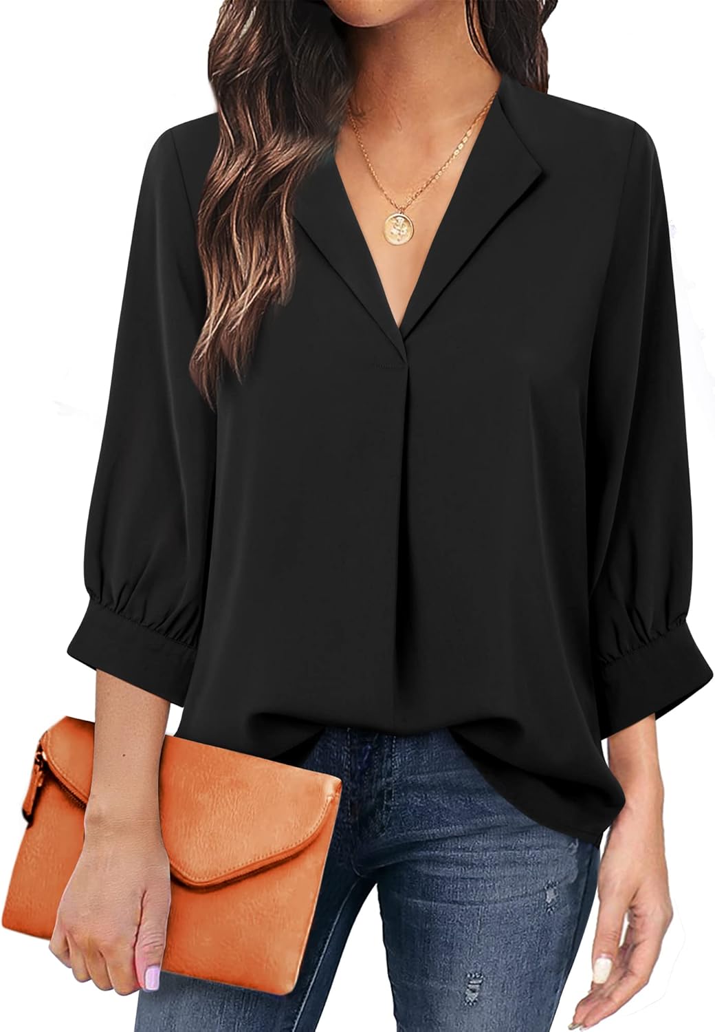 Unixseque Women’s Casual Chiffon V Neck 3/4 Sleeve Business Tops Loose Work Blouses