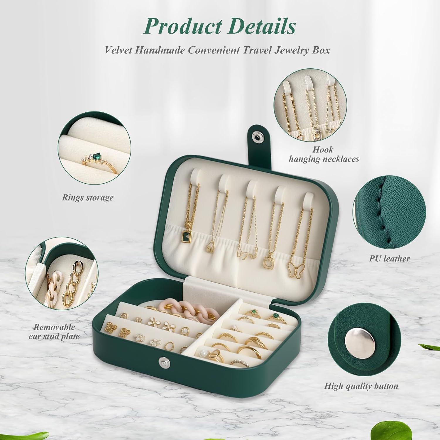 Be the first to review “Travel Jewelry Box, PU Leather Small Jewelry Organizer for Women and Girls, Double-Layer Portable Mini Case for Earrings, Rings, and Necklaces (Emerald Green)” Cancel reply