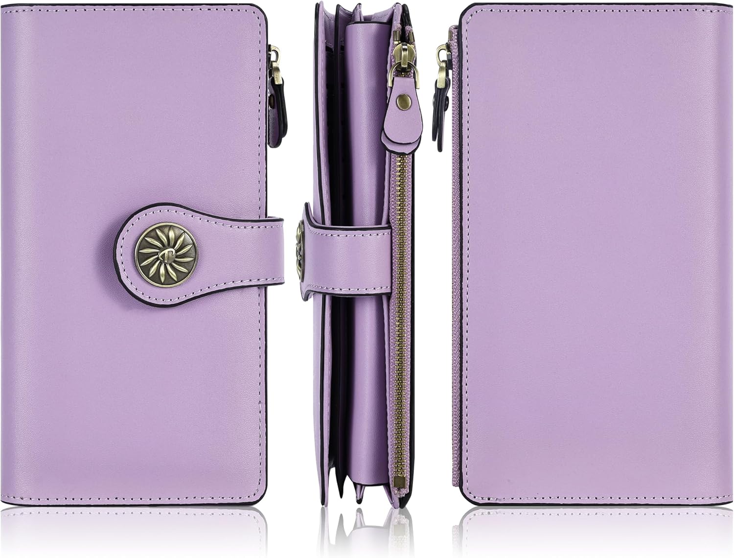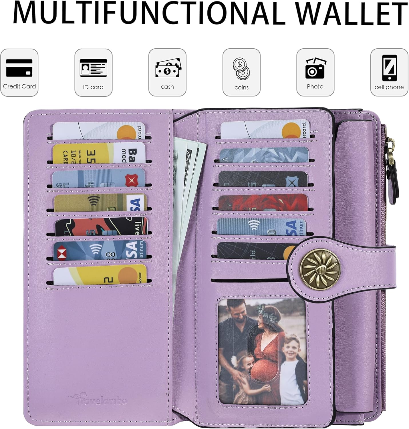 Travelambo Womens RFID Blocking Large Capacity Luxury Waxed Genuine Leather Clutch Wallet Multi Card Organizer (ReNapa Light Purple)
