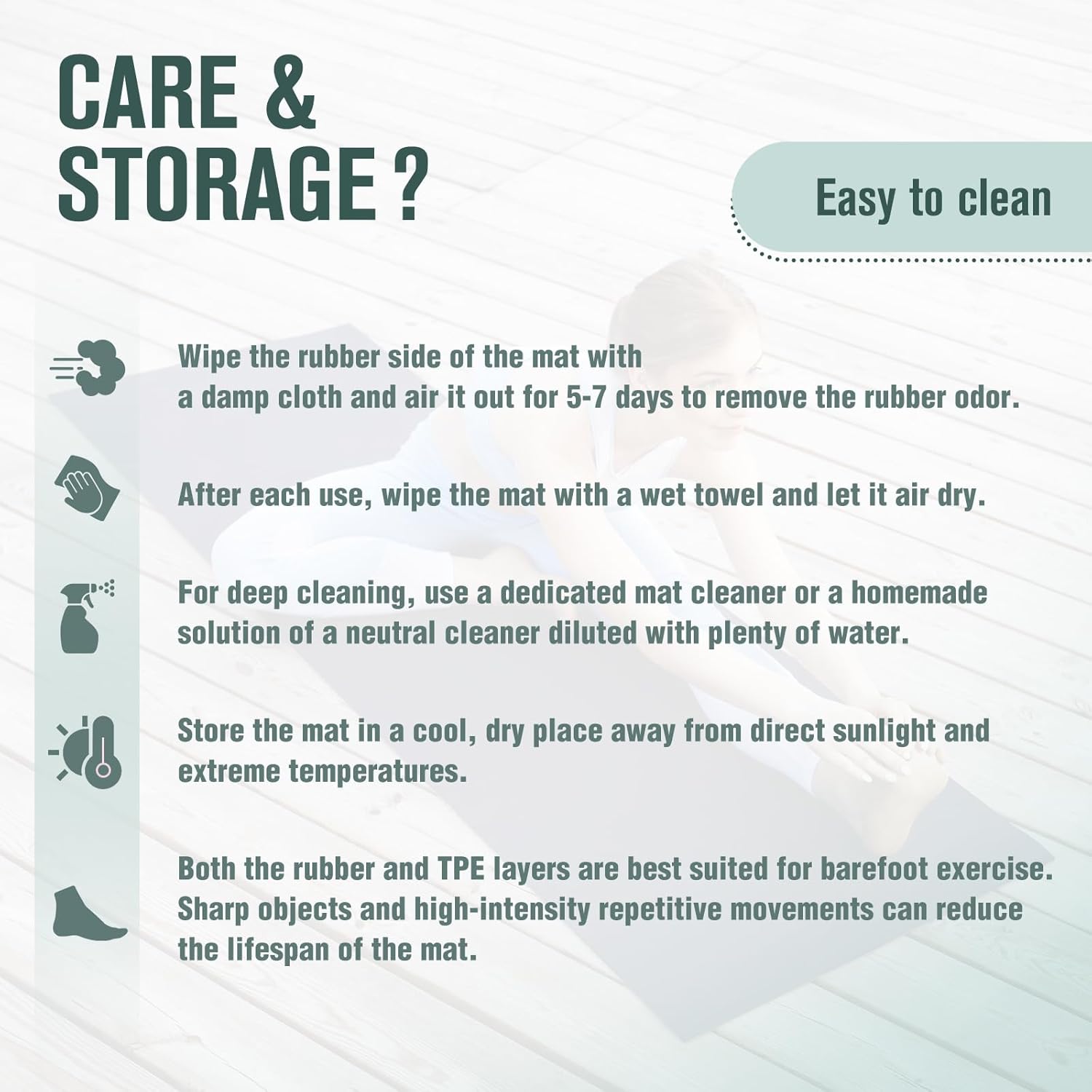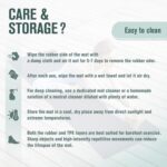 CARE INSTRUCTION – 1. All natural rubber possesses a harmless odor of rubber. Wipe the surface of the rubber side with a damp cloth and place it in a cool, well-ventilated area for a period of 5-7 days, the odor shall gradually dissipate. 2. Clean the yoga mat by wiping the surface with a wet towel. Let it air dry naturally before storing. And store the yoga mat in a cool, dry place away from direct sunlight and extreme temperatures.