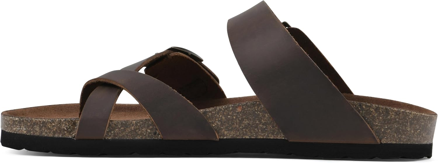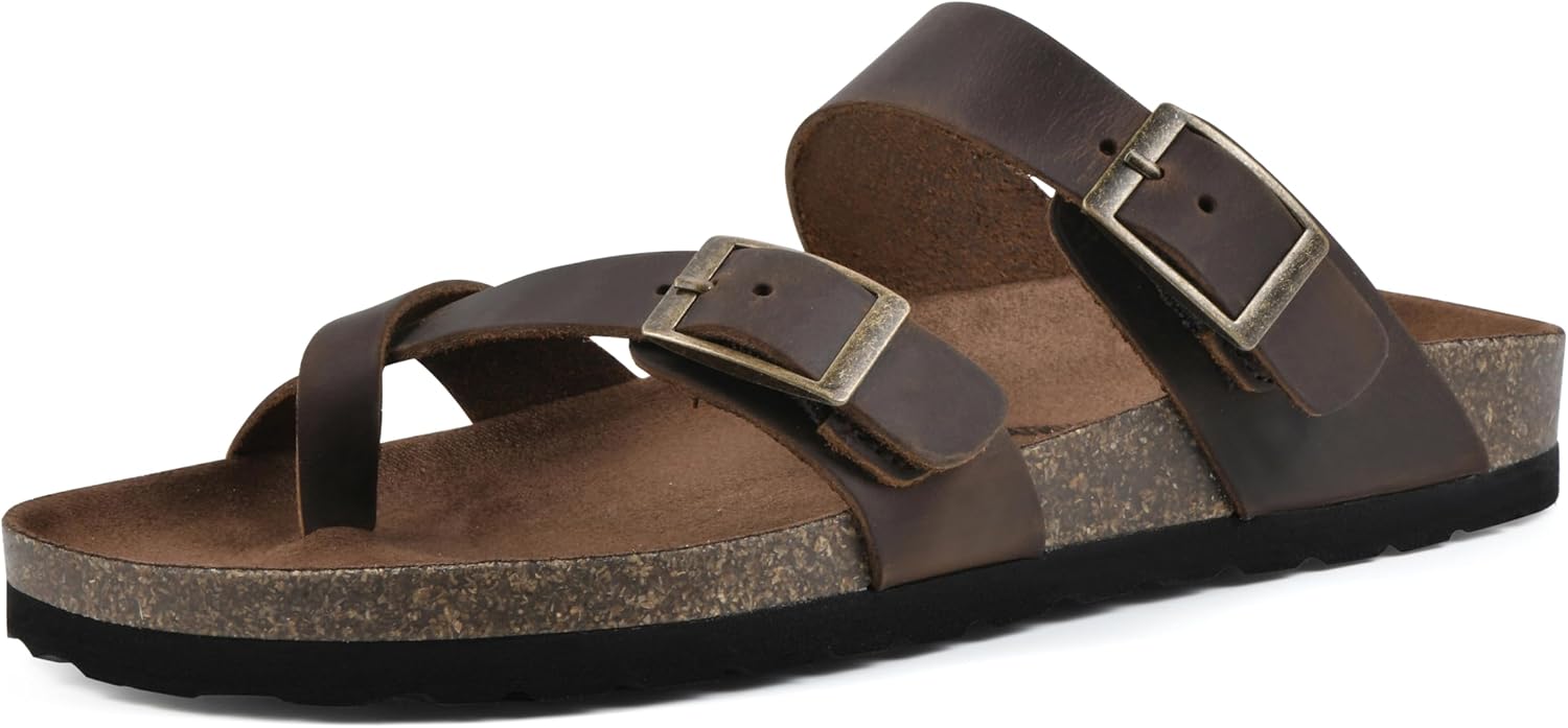 Footbed thong features 2 adjustable bands for perfect fit. Cork wrapped footbed is lightweight and flexible. All leather upper and suedette lined.