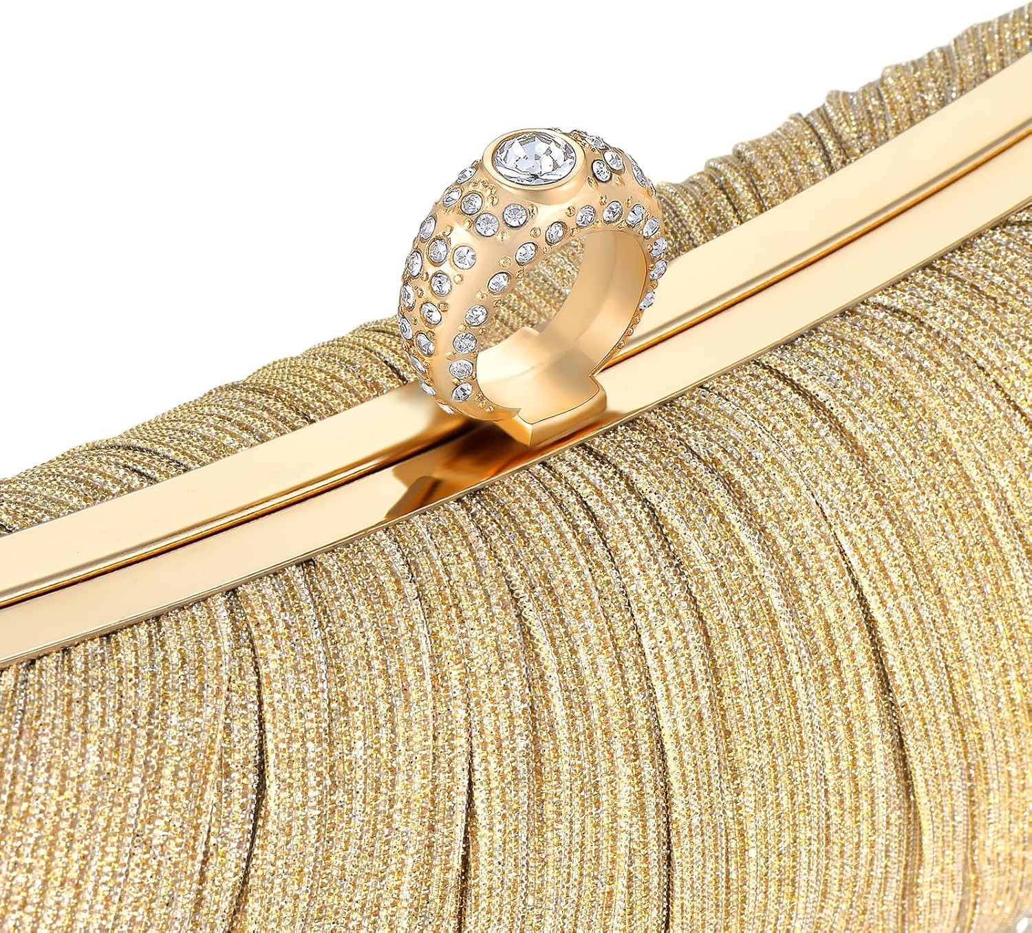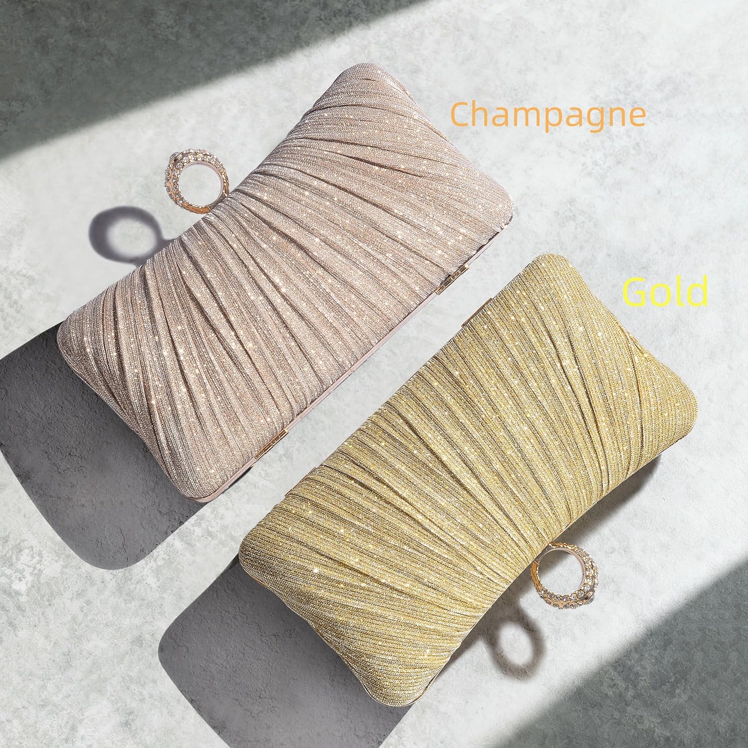 Womens Golden Glitter Clutch Purse Pleated Evening Bag for Bridal Wedding Party with Rhinestone Ring