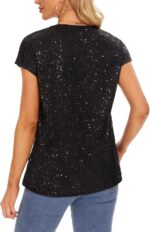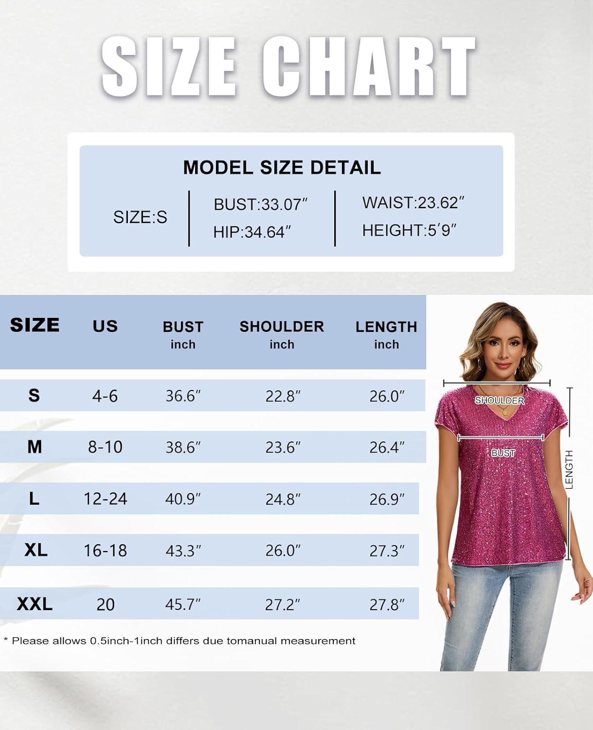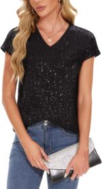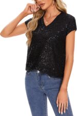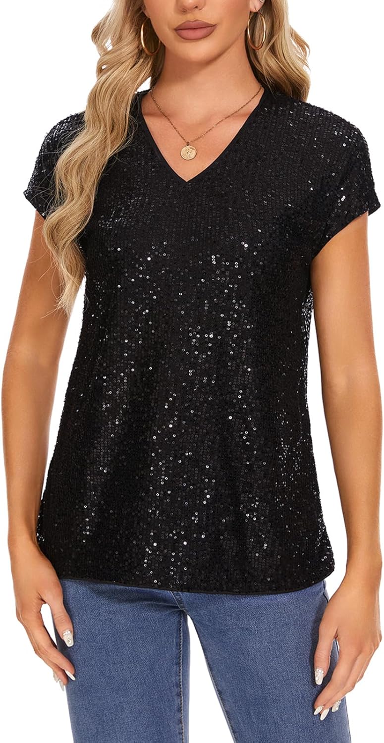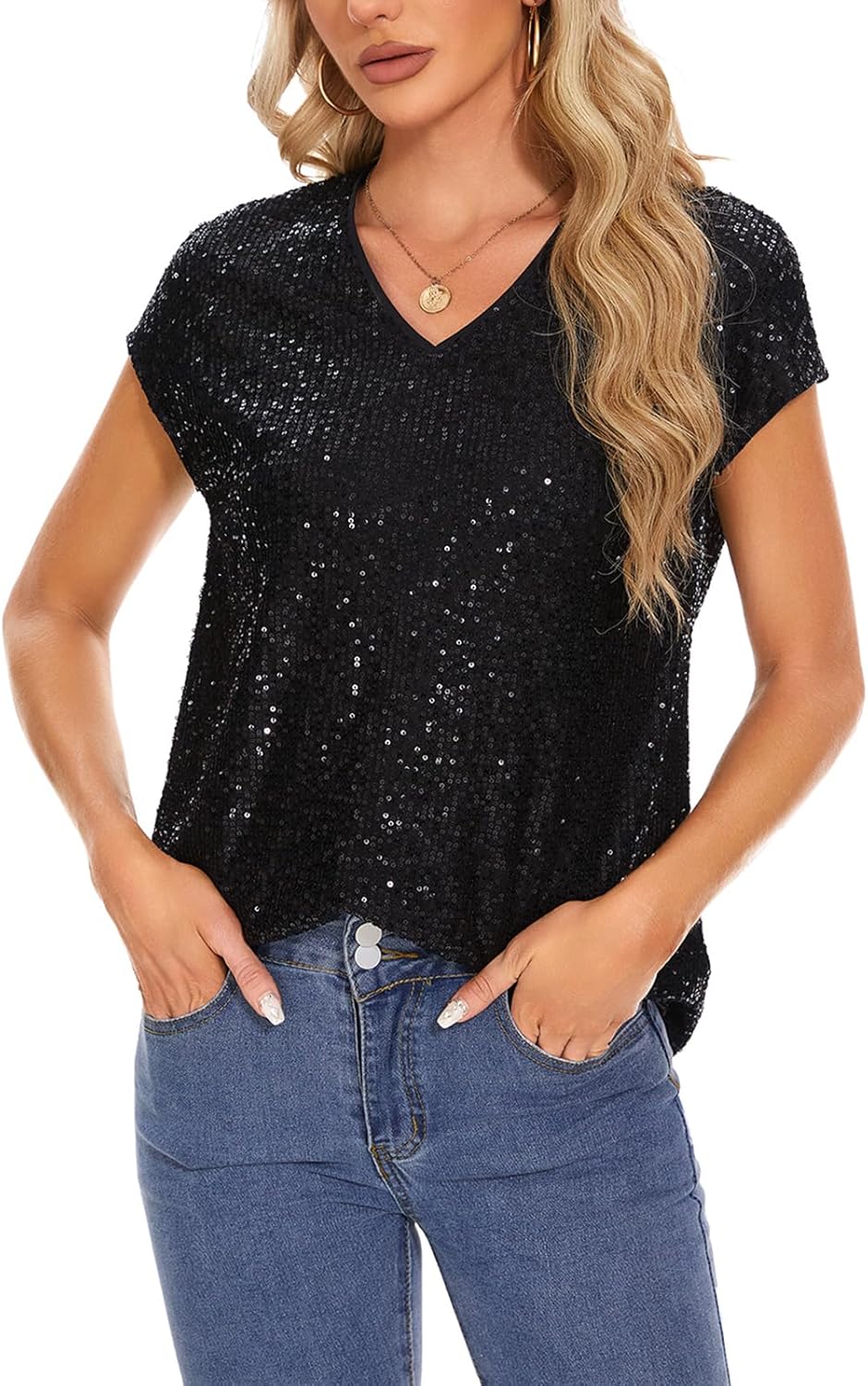 LADI TREND Women’s Sparkle Sequin Top Shimmer Glitter Blouse V Neck Cap Sleeve Club Party Shirt