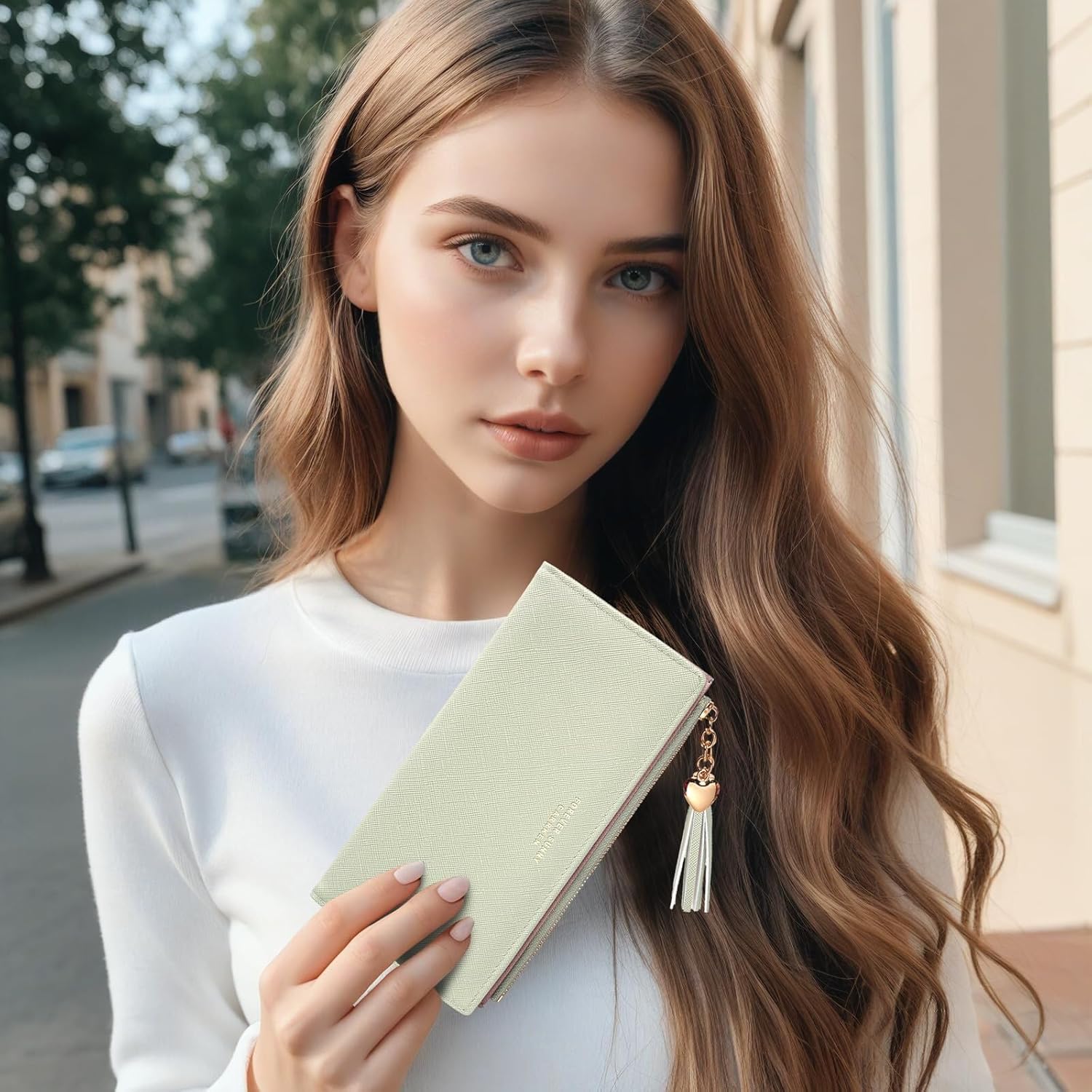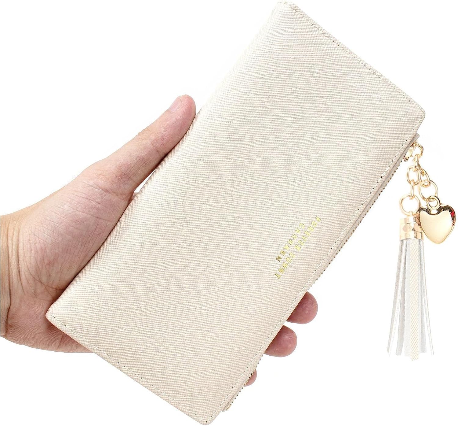 Womens Wallet Cute Elegant Long Slim Card Holder Case Minimalist Coin Purse Thin Tassels Zip Clutch Wallets for Girls Ladies, Beige, L, Contemporary