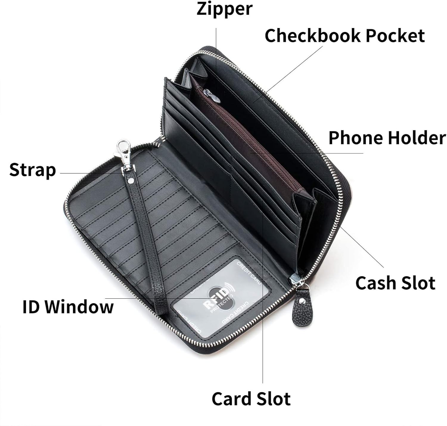 Practical Features: 15 Card Slots, 1 ID Window, 1 zipped coin pocket, 4 open compartment for cash, checkbook, phone and passport. 1 removable leather wristlet strap.The zip around wallet for women is stylish and functional, keep all everyday essentials in one safe place