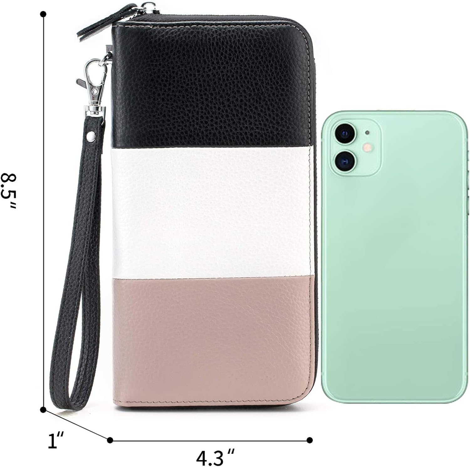 Womens Wallet RFID Blocking Genuine Leather Multi Credit Card Large Capacity Zip Around Clutch Travel Purse Wristlet, Black/White/Grey, Large, Rfid Wallet
