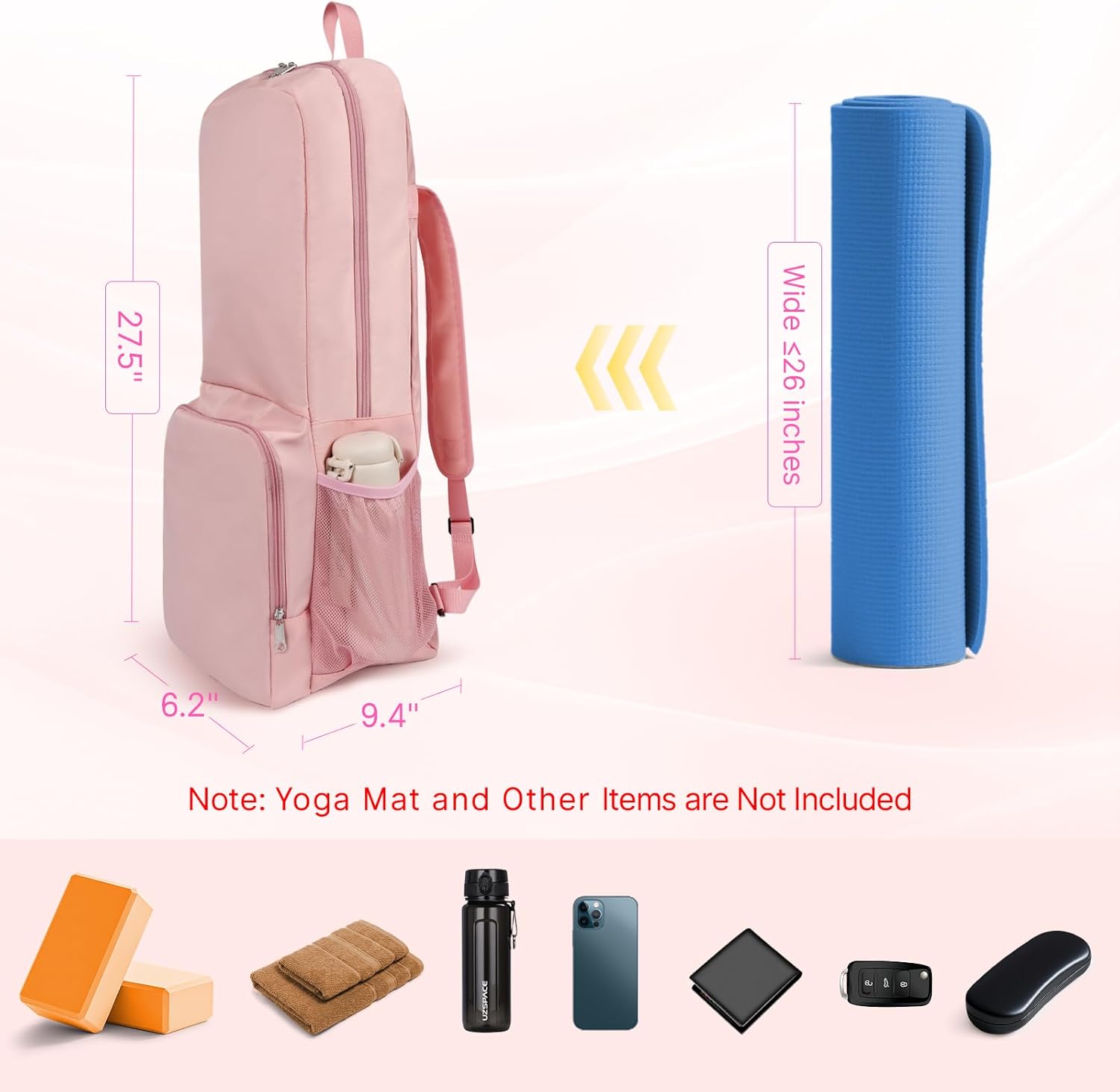 Expanded Compartment: Designed with water-resistant interlining, it is suitable for storing your yoga mat and is easy to put in and take out. Fits a yoga mat up to 26″ wide and 0.5″ thick, 2 yoga blocks 9″L x 6″ W x 3″ H. (Please note: yoga mat and blocks are Not included)