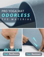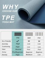 COMFY · HIGHLY ELASTIC TPE MATERIAL – More expensive but worth it. TPE is the latest technological improvement to the traditional yoga mats. No latex, no PVC, or any heavy metal