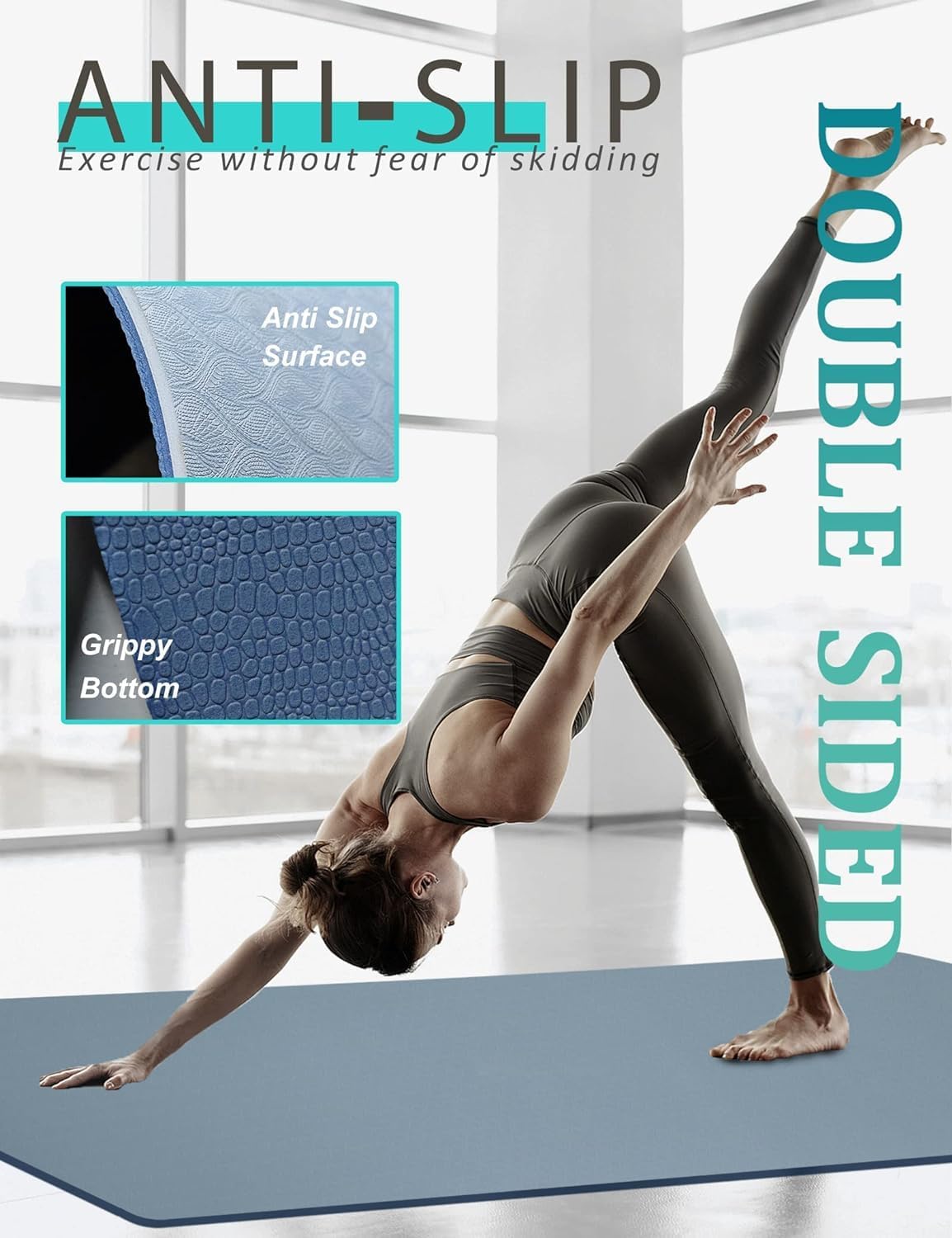 DOUBLE-SIDED NON-SLIP – This workout mat has double-sided non-slip surfaces. Wavy undersides make excellent traction on the floor. It unrolls pretty flat and stays put. Special textured surface prevents your hands and feet from sliding when you sweat on it