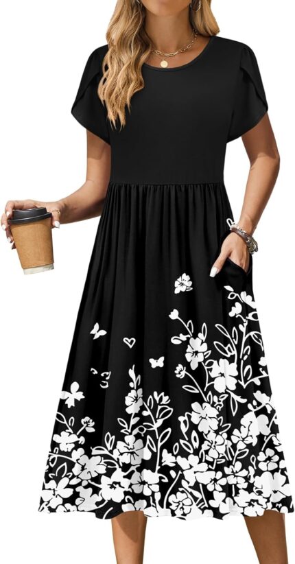 Zeagoo Women Summer Short Sleeve Midi Dress with Pockets Casual Aline Flowy Tshirt Dress Floral Vocation Beach Sundress